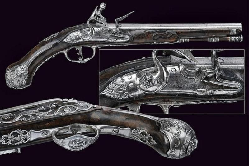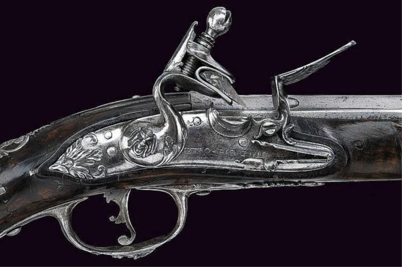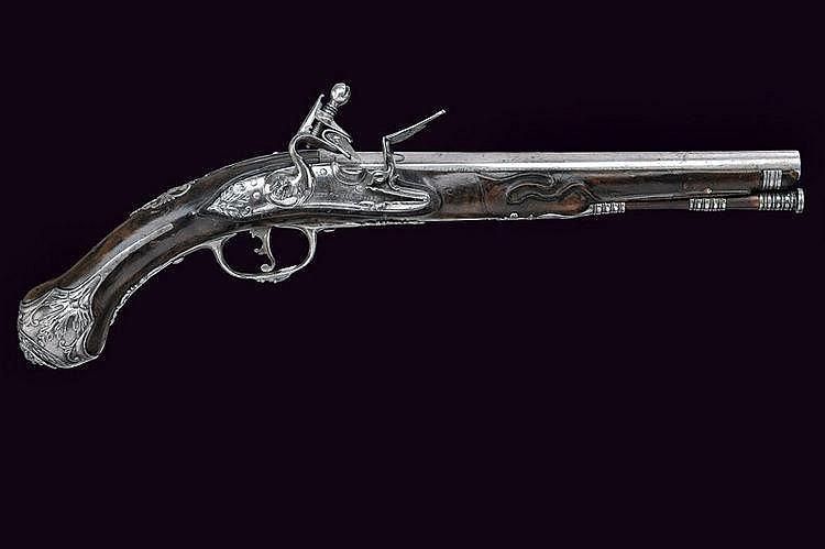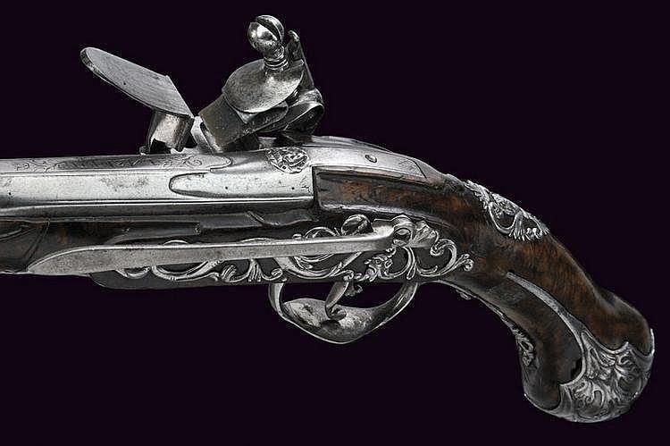 A flintlock pistol Smooth, round, 12 mm cal. barrel, with square base and rib, signed "LAZARIN", a bas-relieved lion head at the breech; lock signed "PIETRO FIORENTI", partially sculpted with foliage, a mask at the screw of the hammer.