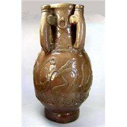 A four handled baluster mushroom glazed vase, the diamond diaper incised neck applied with begging beast handles above relief moulded stylised prehistoric birds with snakes in their beaks, castle sprig mark, 38cm high Another similar vase in this sale is incised 'Babylonian Temp' within the footrim. The Binghams seem to have used the abbreviation of Tempus for several periods of inspiration £120-180