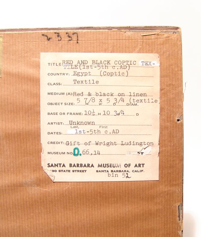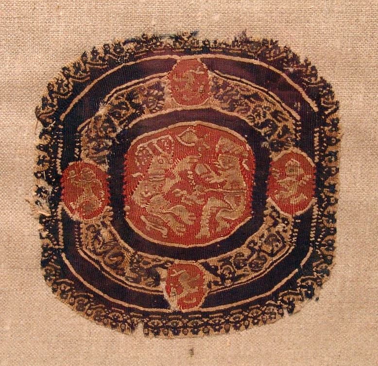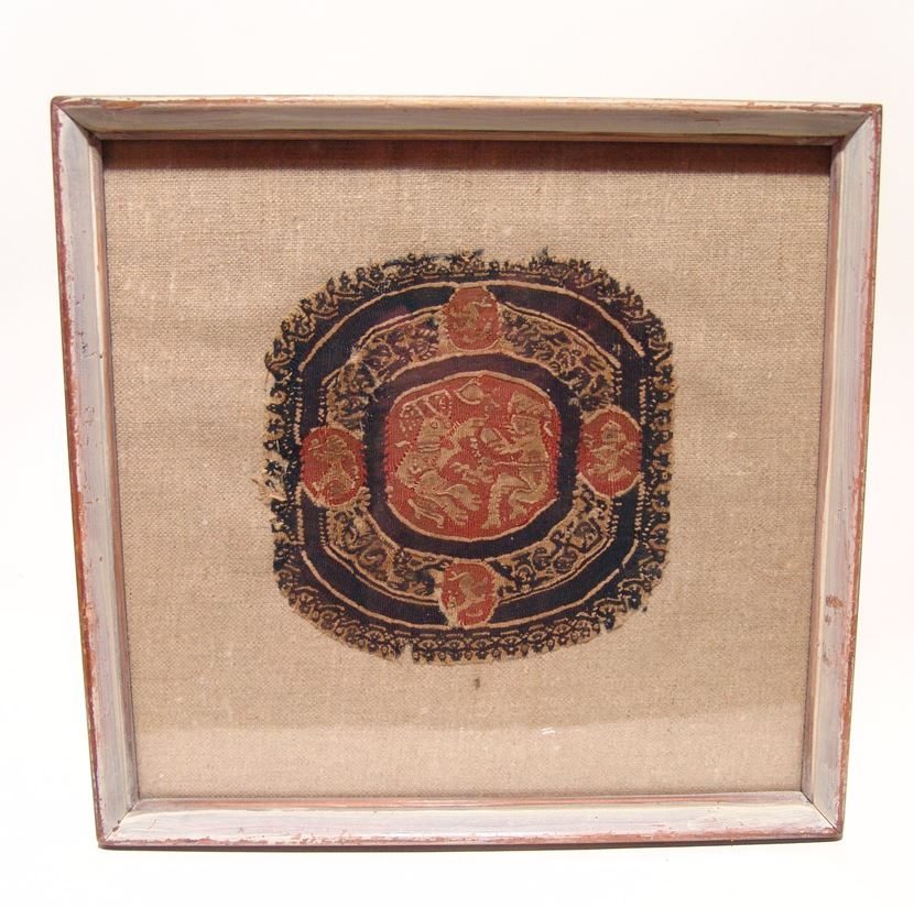 A framed Coptic textile fragment,Roman Egypt, c. 3rd - 4th Century AD, with a medallion, at center a seated man offers an uncertain object to a bear-like animal which sits across, a fish above. Around them are decorative bands consisting of floral motives and red ovals containing various animals, a geometric fringe around the exterior. A lovely embroidered element from a tunic or similar with vivid red and black against a crème ground. Textile measures 5 7/8 in x 5 3/4 in (14.9 x 14.7 cm). Entire frame measures 101/4 in x 10 3/4 in (26 x 27.2 cm). Ex Santa Barbara Museum of Art.
