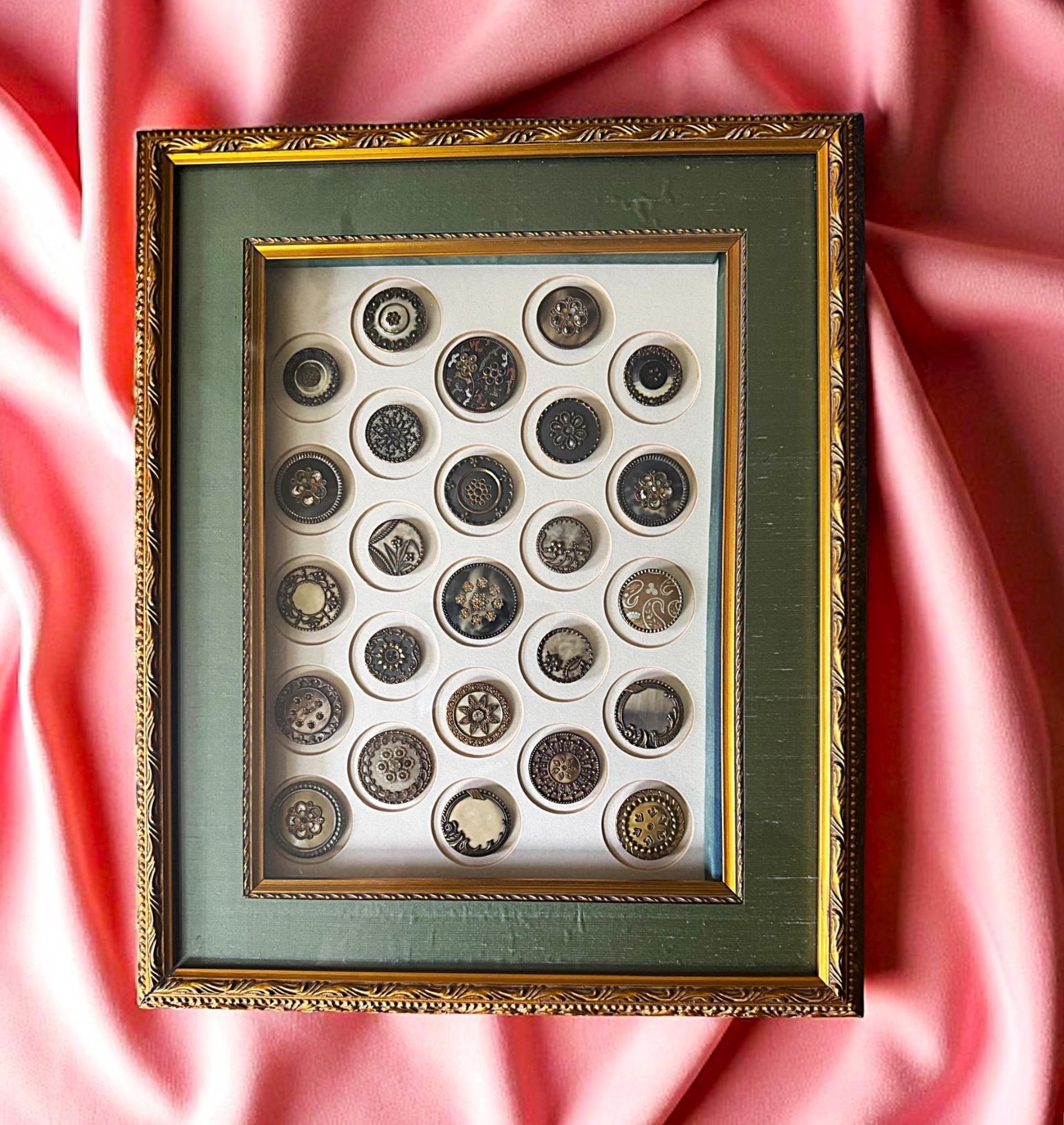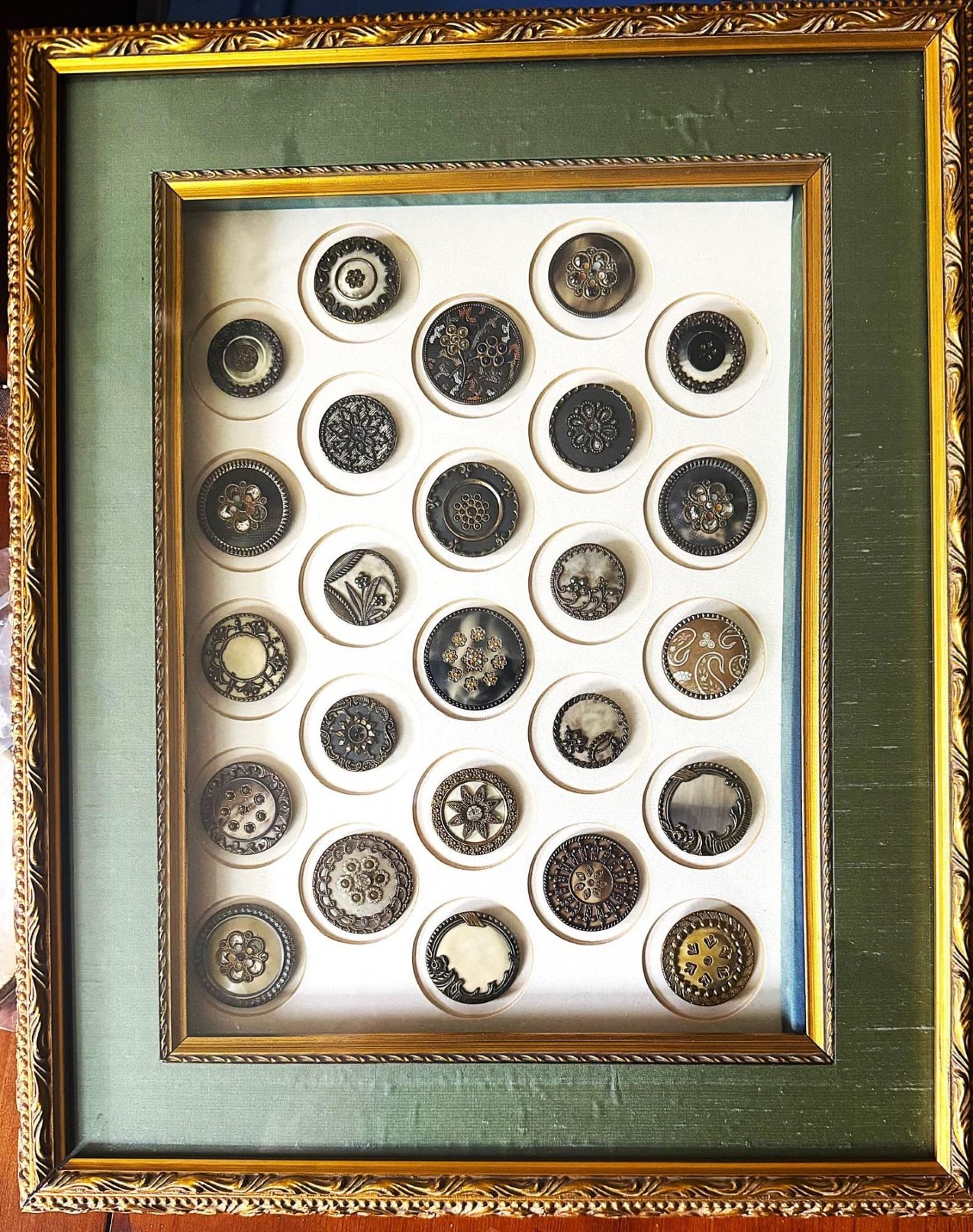 24 Medium/Large 19th century Victorian examples assorted. The late Paula Norby of the Carolina's compiled this beautiful selection of late 19th century celluloids known to collectors as Victorian Celluloids. The tray has a large variety of styles and patterns. The frames they are in are custom made that she commissioned to be made. The frames are heavy gold gesso work style antique looking frame shadow boxes. We did not remove the button cards to size the buttons but believe they are a mix of medium and large but mostly large. The frames we are sure were very costly as they are absolutely beautiful on their own.