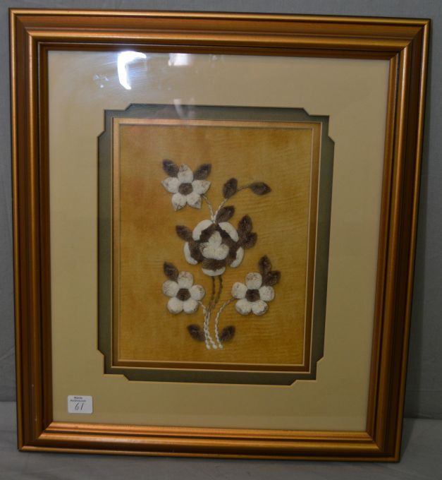 A framed floral motif moose tufting, overall dimensions 18" X 16"