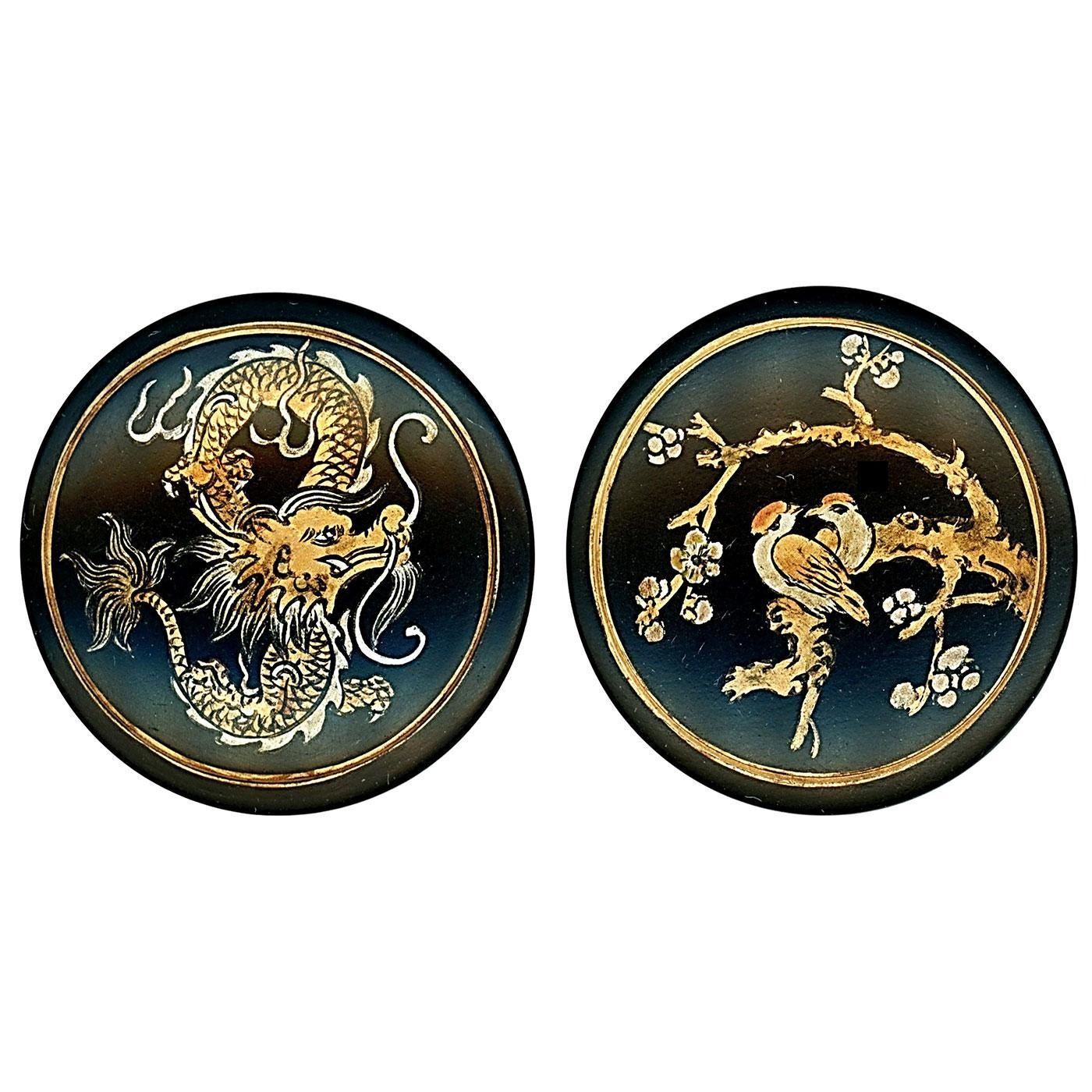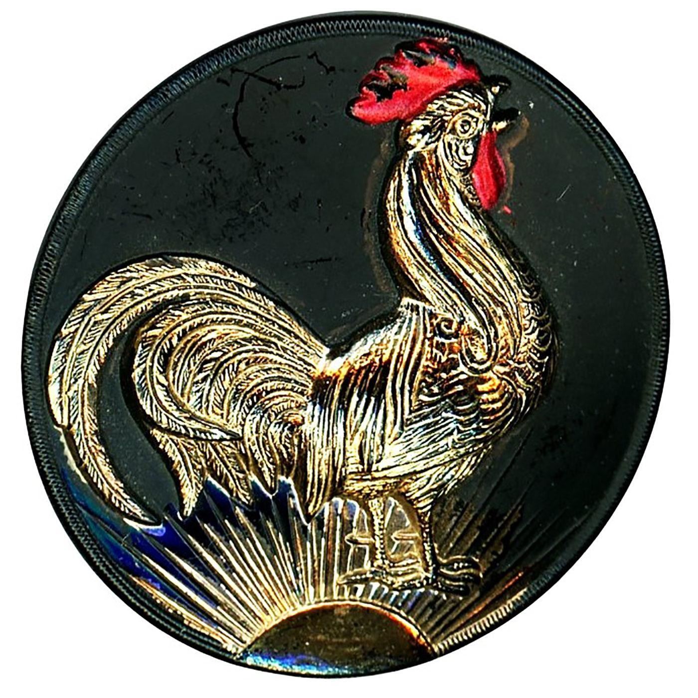 20 Large 19th-20th century assorted pictorial examples. Here is a nice card of assorted materials to included hand painted wood, realistic enameled copper shape fans, a high wheeler watch crystal, an extra large black glass and gold lustered rooster. Also included is black glass in metal, a steel cup deer, a wonderful black velvet background, a wonderful screen background fruit, and more.