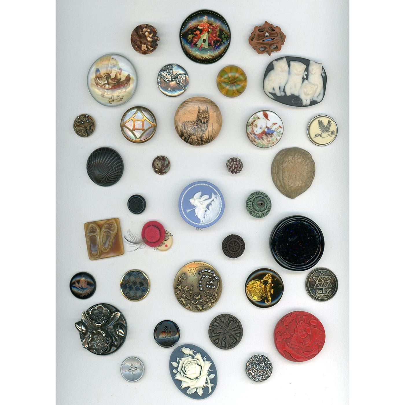 35 S/M/L 19th-20th century assorted subject matter examples. This lot is a card of assorted materials, assorted subjects and assorted designs. A nice assortment of buttons to include Russian Lacquer, wood pictorials, a great bone painted garter, a butterscotch horn pair of shoes, CATS and more.