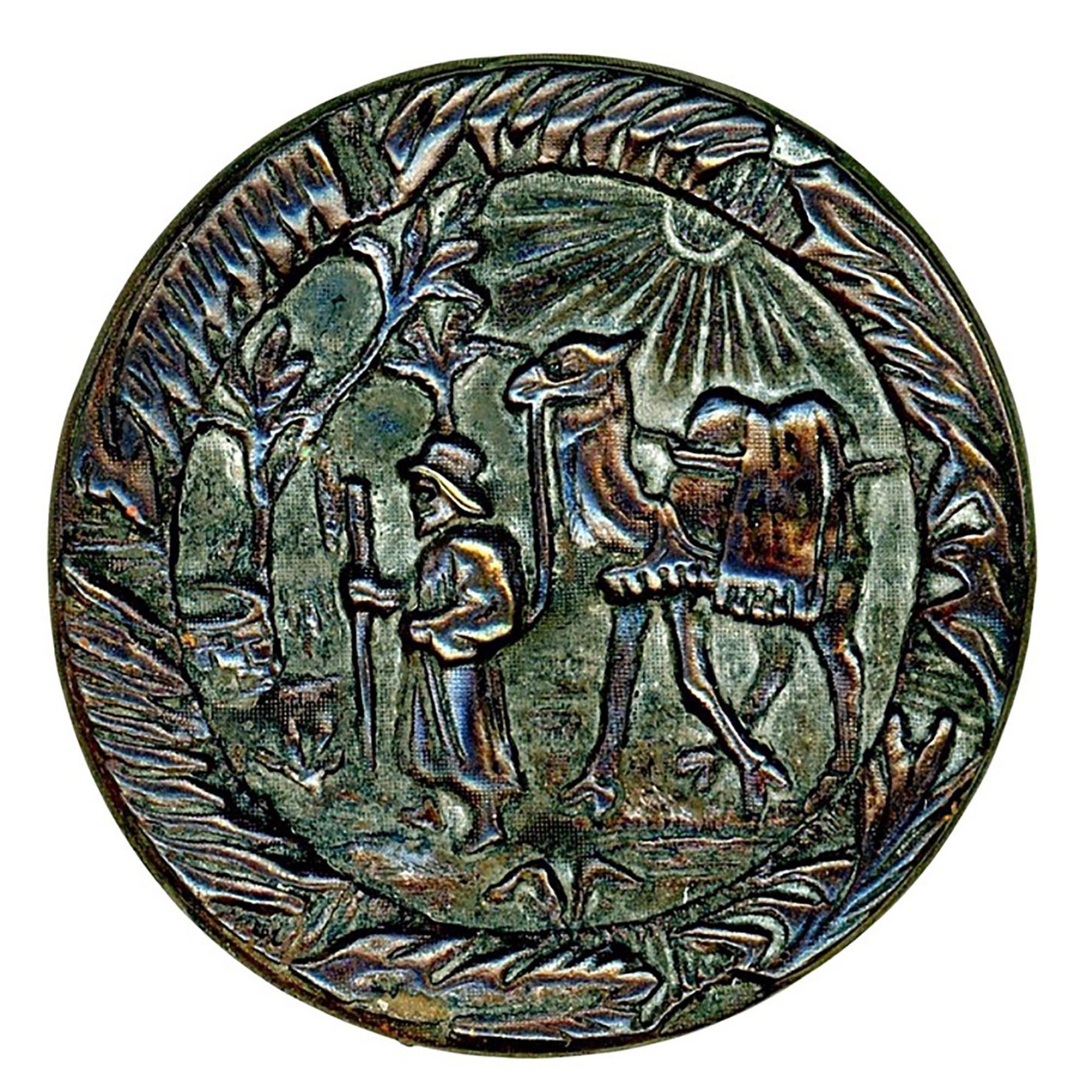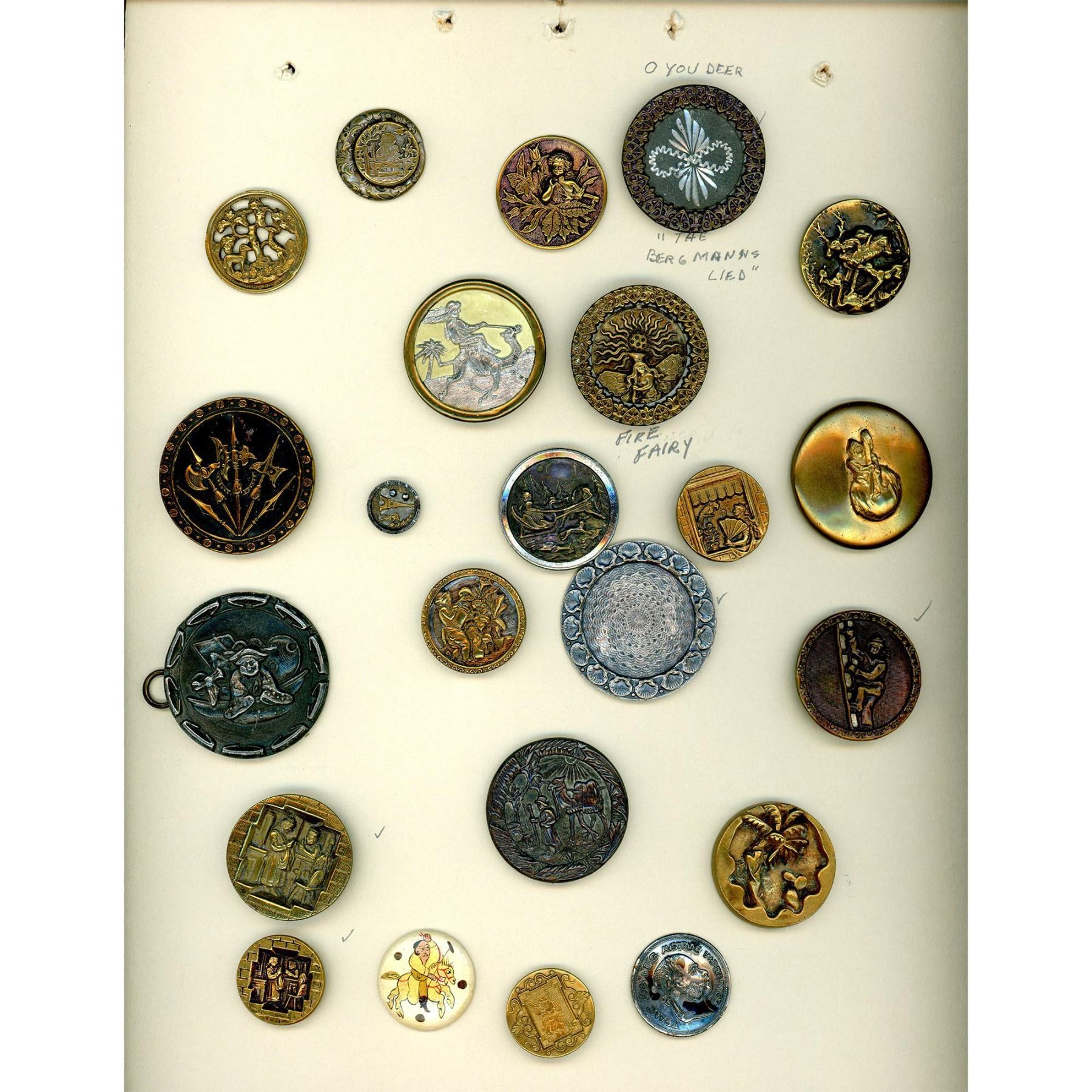 23 S/M/L 19th C. assorted pictorial examples. This lot is for a card of pictorials in mostly assorted metal but also includes a wonderful gilded and painted wood equestrian example. Notice the very cool clamshell border on the intricate patterned silvered brass example. There are many good buttons in this lot so look closely.