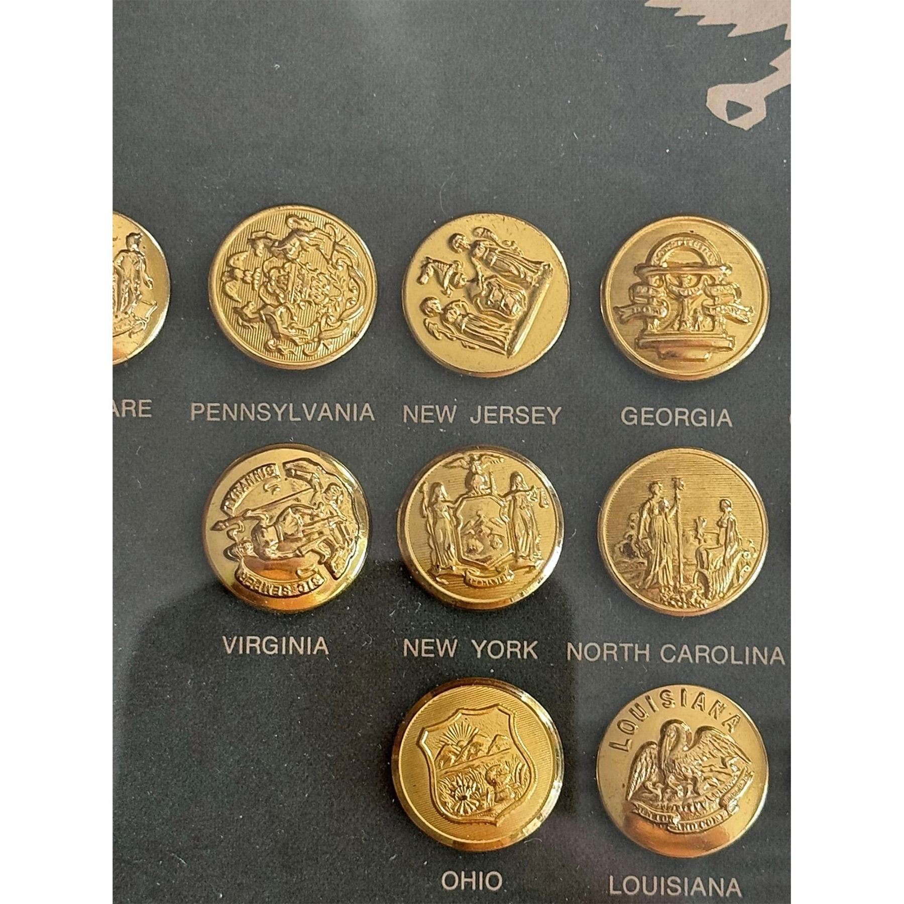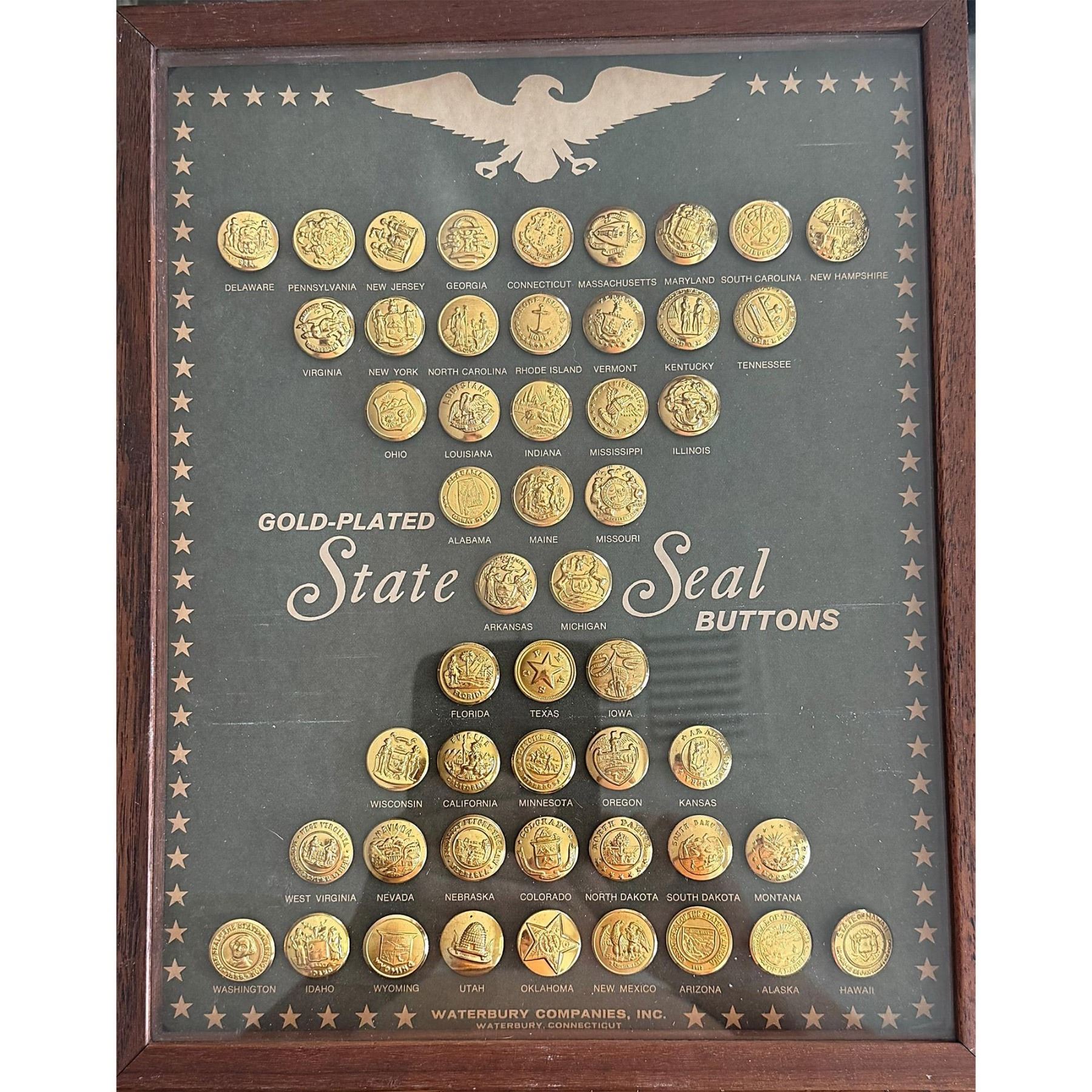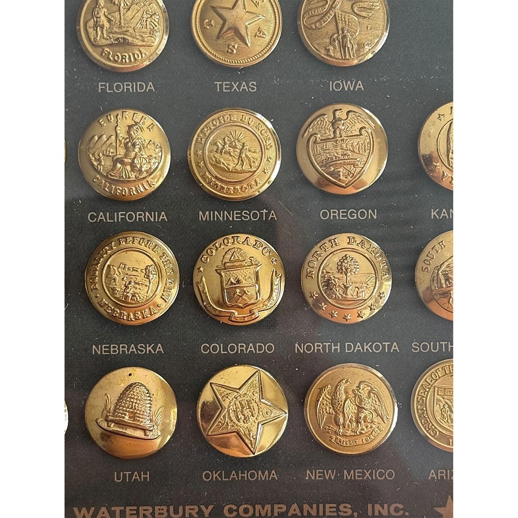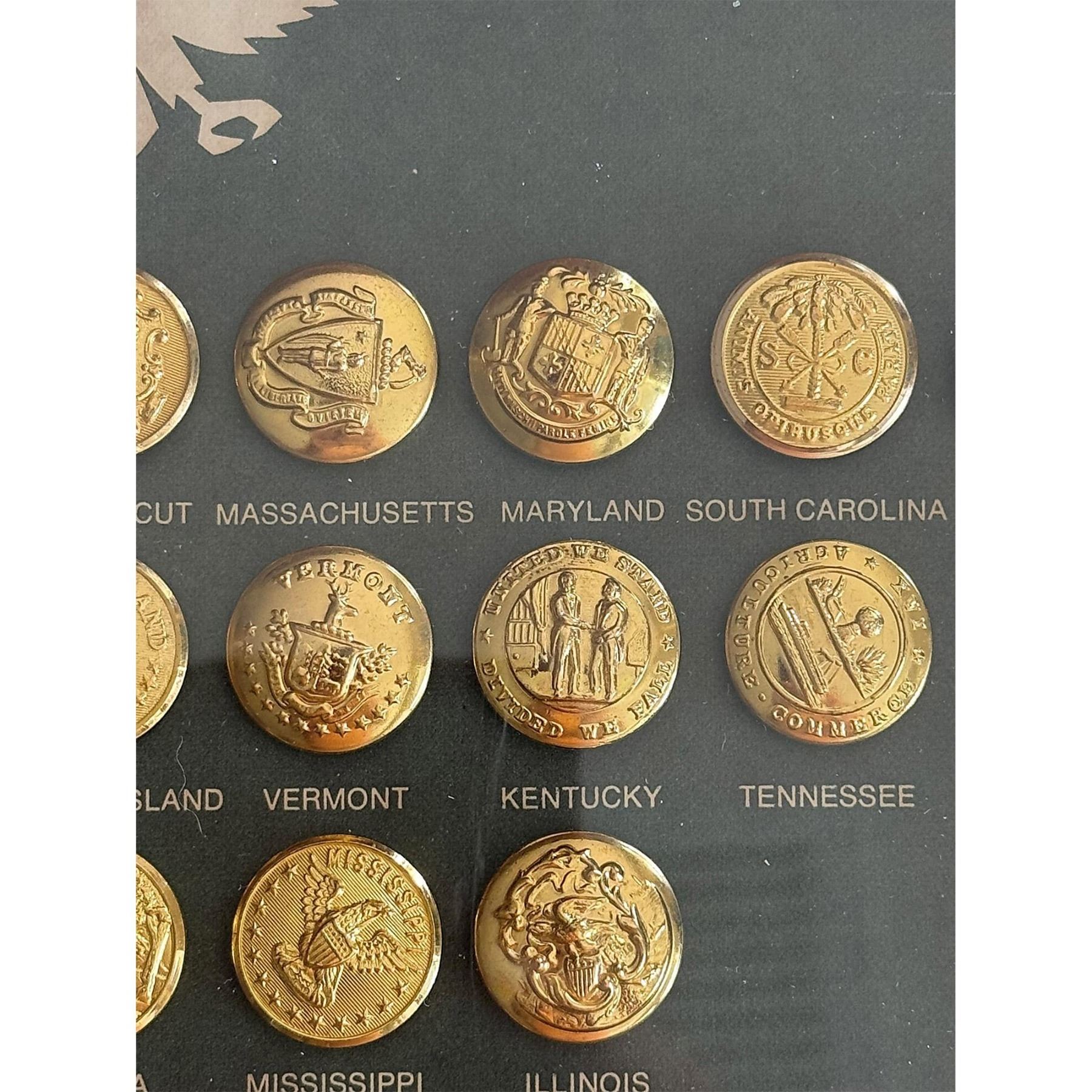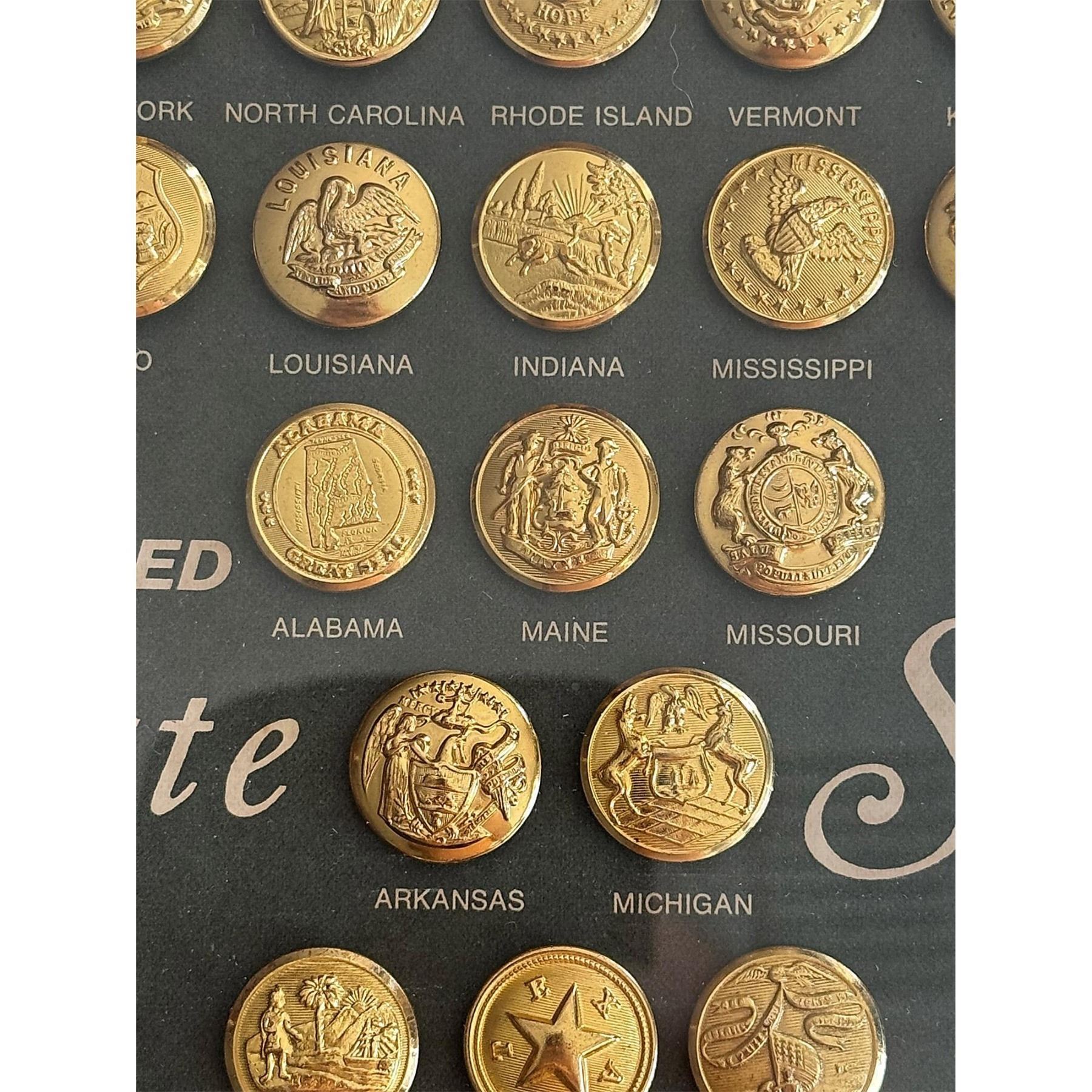 50 Medium brass buttons representing 50 individual State seals. Here is a wonderfully presented group of Sate Seal buttons of all the United States on an origonal card and framed under glass ready to hang in your home as a piece of history and art.