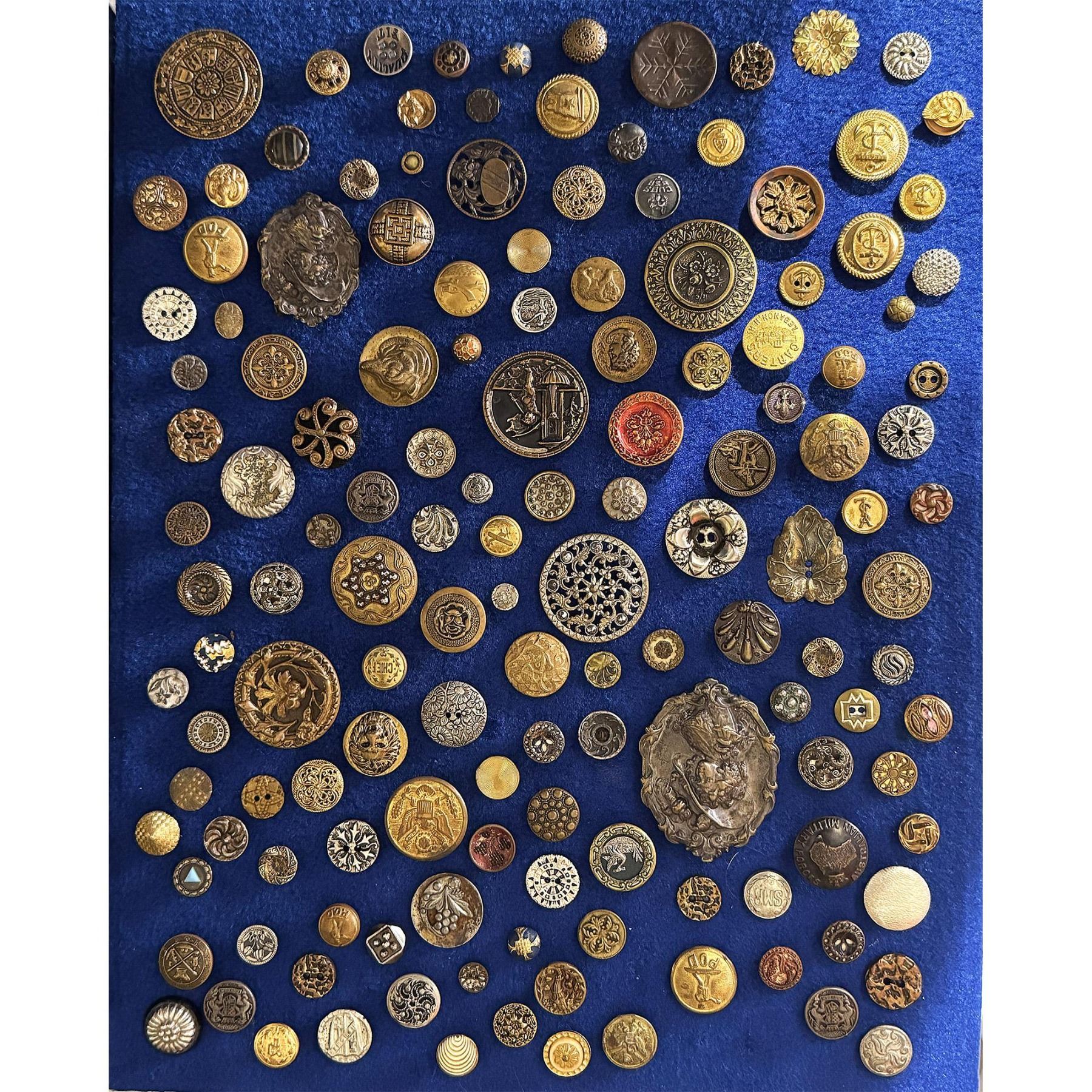 Over 100 19th century metal buttons including pictorials. The collector of this selection collected back in the 1940's and 50's and compiled large cards like this example of an assortement of buttons. This lot is filled with a vast variety of metal buttons in patterns and pictorials so take a real close look. Lots of great buttons for the collector as well as the crafter.