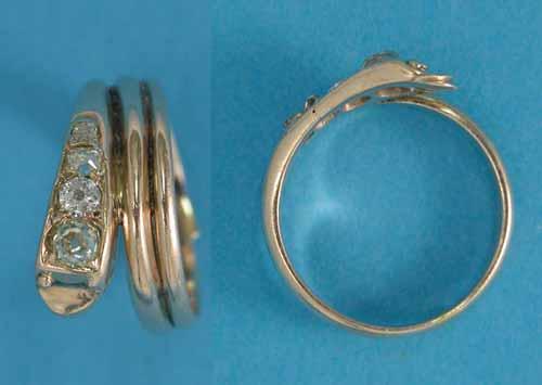 A gentleman's Victorian gold snake ring, the head set 4 diamonds £280-320