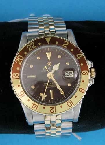 A gentleman's steel and gold Rolex Oyster GMT Master wrist watch, with red dial £1,000-1,500