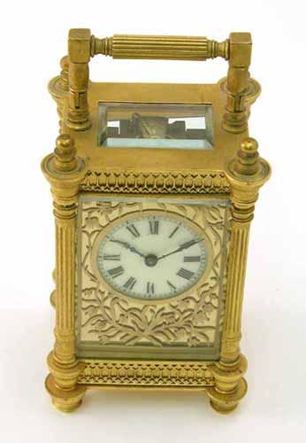 A gilt brass carriage timepiece, with enamelled dial and filigree surround, movement signed R & C...