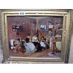 A gilt framed 19thC-painting oil on board of ladies in the parlour.