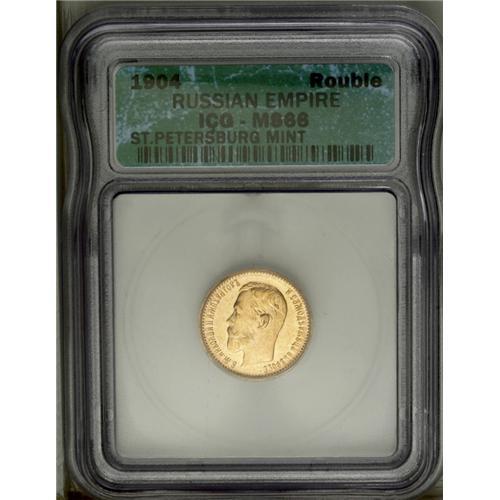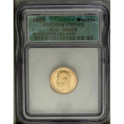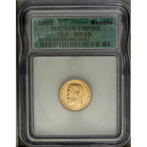 <B>A gold 5 Rouble trio as follows:</B></I> (2)1902 AP, MS66 ICG; and a 1904 AP, MS66 ICG. All are F-180.<BR><BR><b>Shipping:</b> Coin/Currency (<a target="_blank" href="http://www.heritageauctions.com/common/shipping.php">view shipping information</a>)