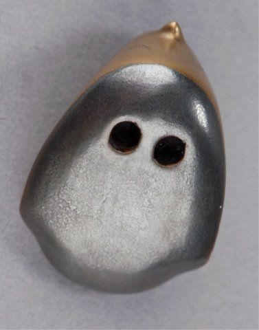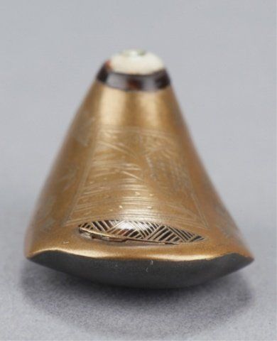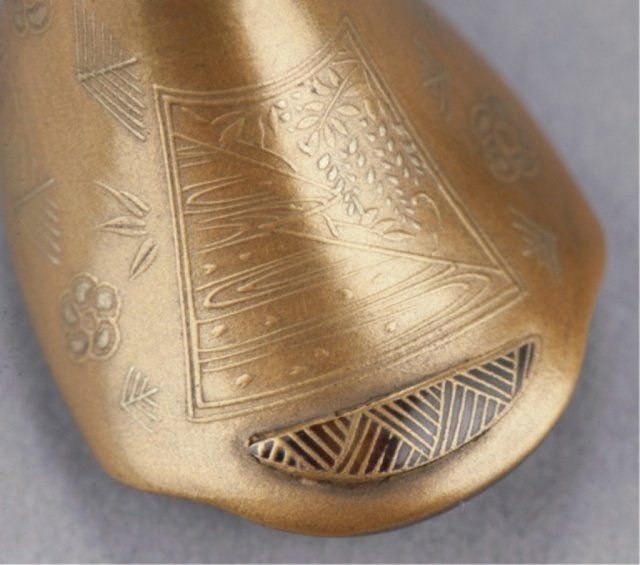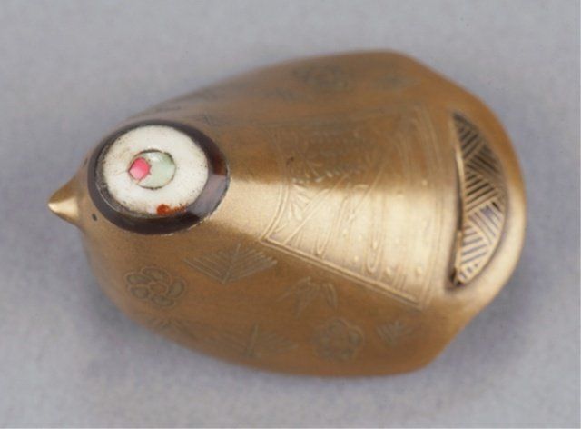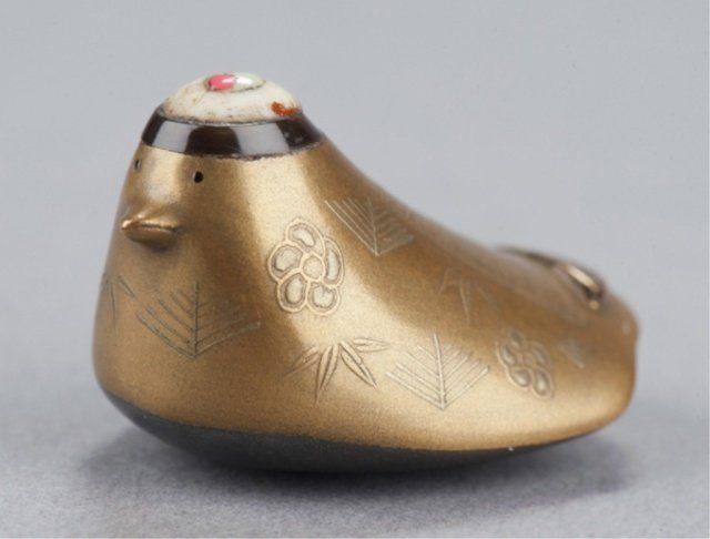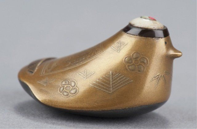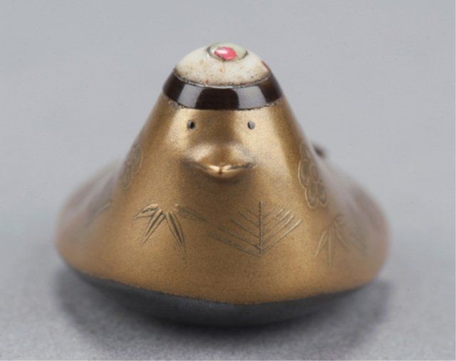 Mid 19th century. Stylized, it bears geometric and floral designs of raised gold lacquer on a gold ground, the underside in silver lacquer, the pate is inlaid in bone with further concentric inlays of jade and tsuishu lacquer, and surrounded by a horn ring. The tail is of inlaid tortoise-shell that has been topped with a geometric design in gold lacquer. 7/8in (2.2cm).