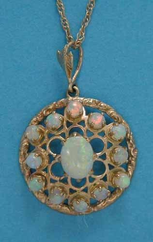 A gold openwork circular pendant, set with a central oval opal bordered by 12 round opals, on fin...