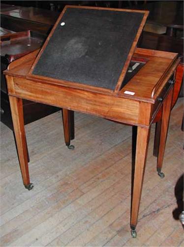 A good 19th century mahogany writing table with adjustable hinged lined writing surface and inkwe...