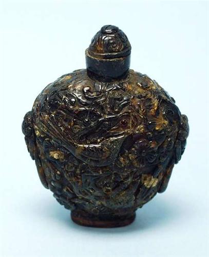 A good Chinese amber snuff bottle. The flask shaped baluster bottle relief carved with peacocks and a pair of Fo dog handles. Matching stopper. 150-200