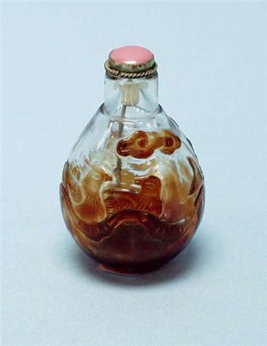 A good Chinese red Peking glass pear shaped snuff bottle, overlaid with stylized waves and fish. With Mongolian silver stopper inlaid with semi-precious stone. 200-250