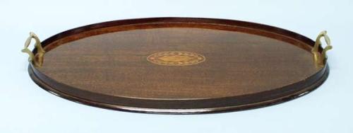 A good Edwardian fruitwood tray with gilt bronze handles. Of oval form, center with a satinwood inlaid medallion. Circa 1920. 24" wide. 500-600