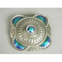 A good Liberty & Co silver brooch with enamelled corners, ropework borders and repousse decoratio...