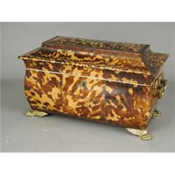 A good Regency tortoiseshell teacaddy of bombe shape, with foliate gilt side handles, on winged lions paw gilt feet, 31.5cm Est. 1800/2200