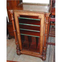 A good Victorian inlaid walnut music cabinet with galleried back and glazed door flanked by turned fluted columns