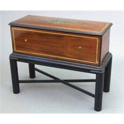A good late 19th century bells in sight music box, with 14 inch brass cylinder and six bells in rosewood and ebonised case with painted and inlaid foliate motif to lid and brass inlay throughout, with metal stand, the tooth cushion with the engraved initials PVE, 33 ins overall £2,000-3,000