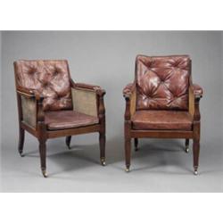 A good pair of Regency mahogany library bergeres, with reeded rectangular backs and padded downswept arms, caned backs, sides and seats, buttoned red leather back and seat cushions, brass nailed armpads, on lobed slender inverted baluster legs, brass socket castors, c.1820
