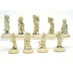 A good set of eight 19th century Dieppe ivory carvings, each a character study of a wolf in costu...