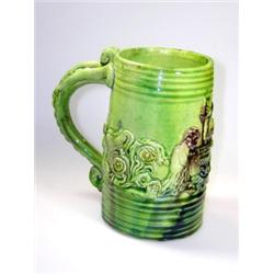 A green frog mug, the tapering cylindrical sides reeded at the top and foot and applied with tritons drinking, foliage and a winged lion, the handle with three scroll upper terminal, the frog inside yellow tinged mauve, incised and sprig marks, 15.5cm high £100-150