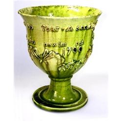 A green glazed goblet with raised and yellow tinted inscription on the rounded body below the flare.