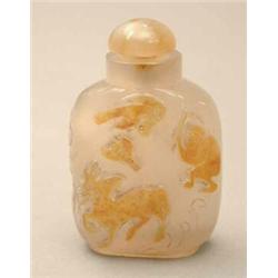 A grey agate rounded square snuff bottle, relief carved with a monkey, deer and bird, stopper, 2.25ins £80-120