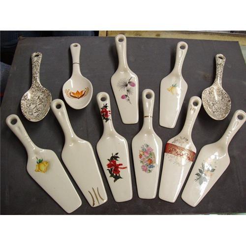This is a collection of Harker Servers. The spoons are 8.5 inches long. The Cake or pie servers are 9.5 inches high. The spoons are 2.875 inches wide at the widest part. The cake servers are 2.5 inches wide at the widest part. I have photographed the small chips on the pine cone server. The Harker spoon with the modern tulip design has some crazing, the rest do not. The gold spoon on the right side has a glaze crack and has soaked in some grease over time, photographed. Booth the spoon show a little wear in the gold. The server with the reddish-brown band on it, the gold is also worn on this one. Other than what I have listed, all others are in great condition These are being sold as a group.