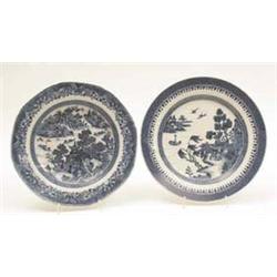 A group of 3 19th century Chinese octagonal blue and white bowls painted with lake landscapes, 9ins and a pair of similar plates, 9ins £100-150