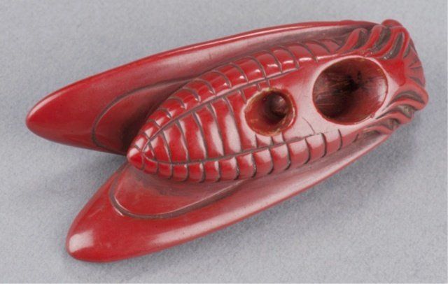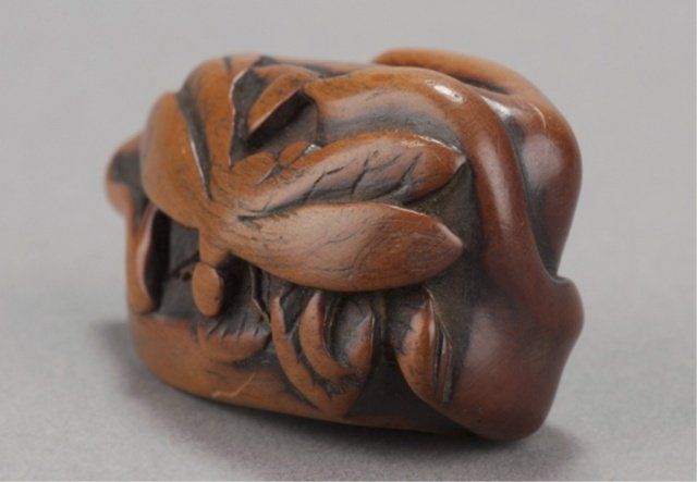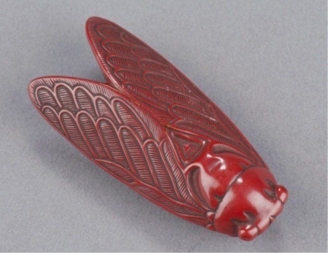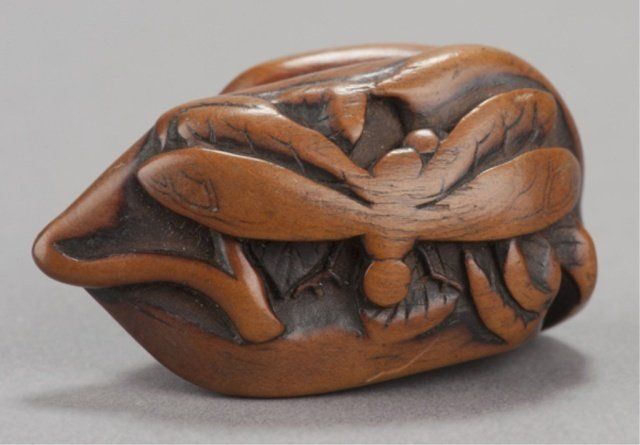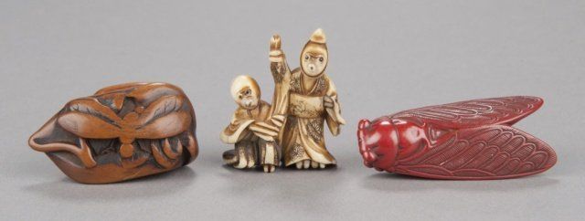 The first, late 18th century, a tsuishi lacquer Cicada, the veining on the wings well delineated and large himotoshi on the underside of unequal size. 2 1/4in (5.8cm). The second, mid 18th century, an ivory piece with two octopi, the eyes of both inlaid with dark horn, dressed in elaborate clothing. 1 7/8in (4.6cm). The third, mid 19th century, a wood dragonfly on bean pods, delicate veining on the wings. 2in (5cm). Provenance: The first, Purchased from Raymond Bushell 1957. The first, Exhibited: Delgado Museum, New Orleans, LA (March-April, 1960)