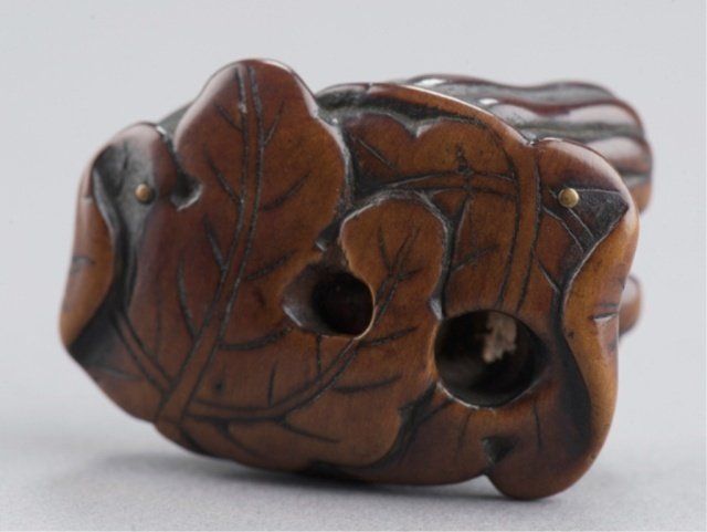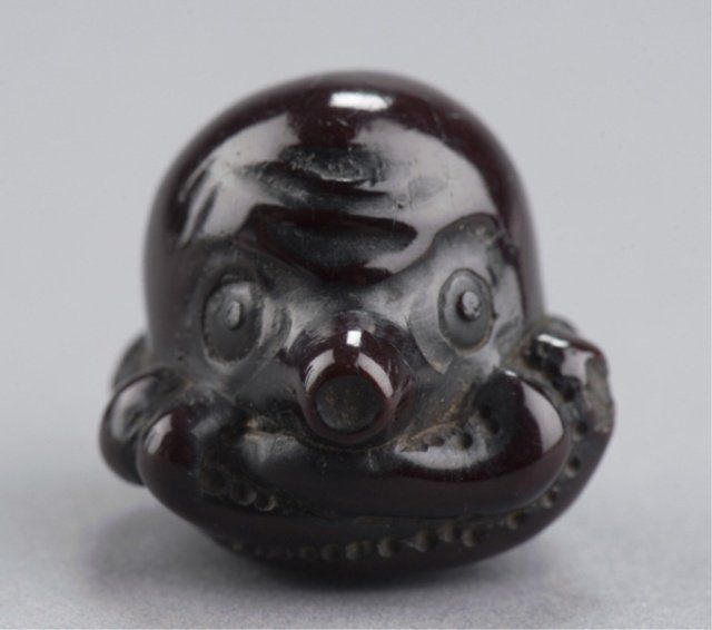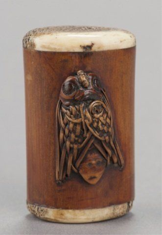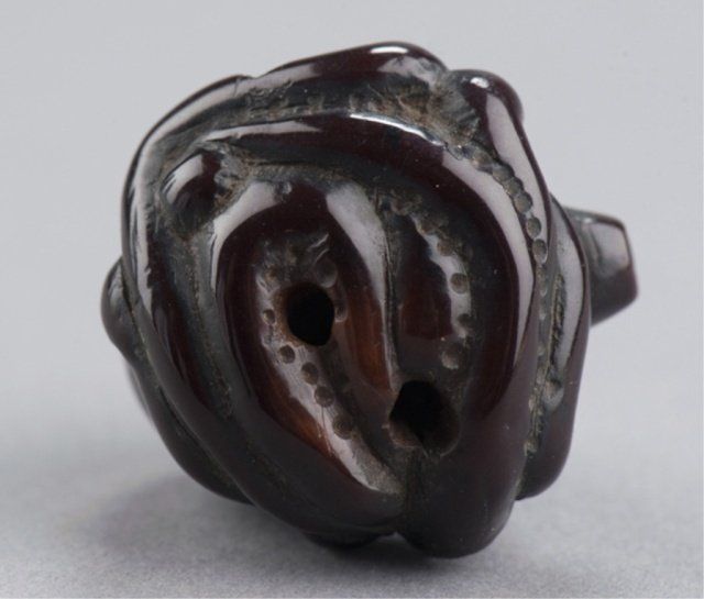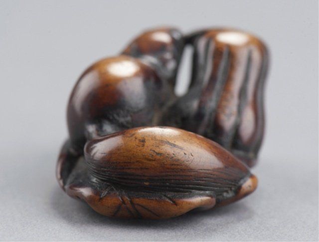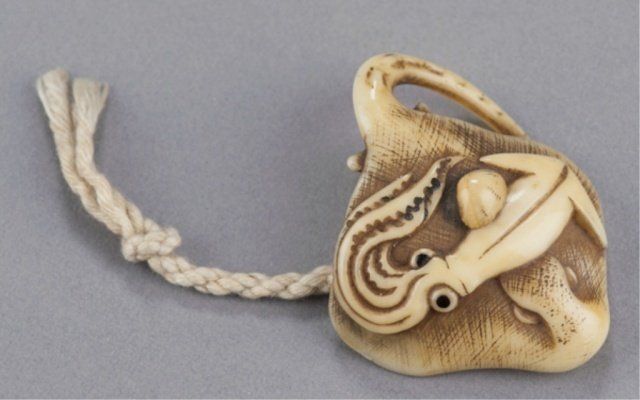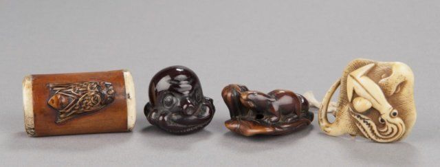 The first, late 19th century, a cicada carved from gnarled wood with wings woven from rattan or leather attached to bamboo capped with spongy stag antler, 1 7/8in (4.9cm). The second, early 19th century, a horn octopus. 1 1/8in (2.9cm). The third, late 18th century, a wood squirrel chewing on the stalk of a pumpkin. 1 3/4in (4.4cm). The fourth, early 19th century, a walrus ivory clubhook squid on the back of a Manta Ray. 1 7/8in (4.9cm) Provenance: The second, Ex Isobel Cunningham collection. The third, Sotheby's, London.