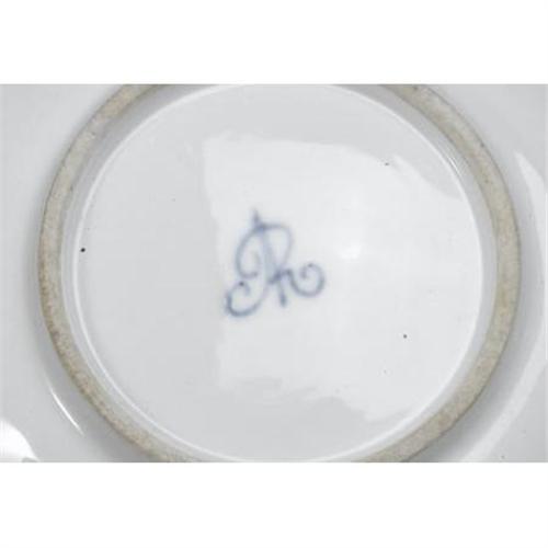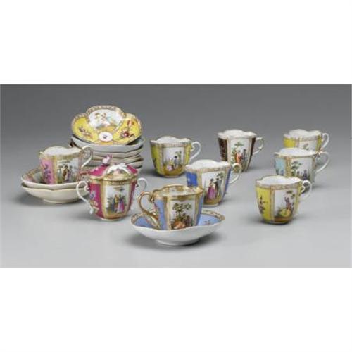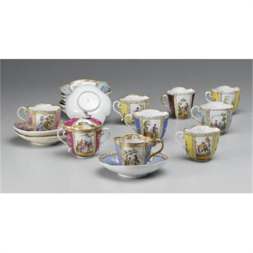 <B>A Group of Dresden Hand-Painted Cups and Saucers<BR></B></I> A group of eight Dresden hand-painted cups and ten saucers, together with a covered sugar dish. Each lobed form decorated with couples in country settings, with floral sprays on assorted colored grounds with gilt embellishments. Augustus Rex marks in underglaze blue.<BR>Cups: 3 inches high<BR> <B>Condition Report:</B> Normal signs of wear as appropriate with age.<BR><BR><b>Shipping:</b> Hollowware/Pottery/Glass, Small (<a target="_blank" href="http://www.heritageauctions.com/common/shipping.php">view shipping information</a>)