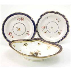 A group of five late 18th century Derby plates, decorated with a central blue and gilt scrolling circle surrounded by sprays of painted flowers within a blue and gilt border and a late 18th century Caughley oval dish decorated with a blue and gilt pattern border, mark to base, 9ins £100-150