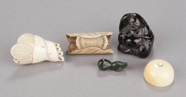 The first, 19/20th century, in bone, sheath form with a leaves and vine motif. 2 3/8in (6cm). The second, mid 19th century, in bone, sheath form of a Cicada. 2in (5.2cm). The third, 19/20th century, in malachite, gourd form, the curled stem forming the himitoshi. 1 1/4in (3.2cm). The fourth, mid 19th century, in umimatsu, Hotei, seated and holding his right hand to the side of his head. 1 7/8in (4.6cm). The fifth, mid 19th century, in ivory, ash tray in a simple cup shape, attachment by an ivory peg at the bottom. 1 1/4in (3.2cm).