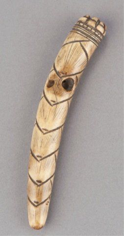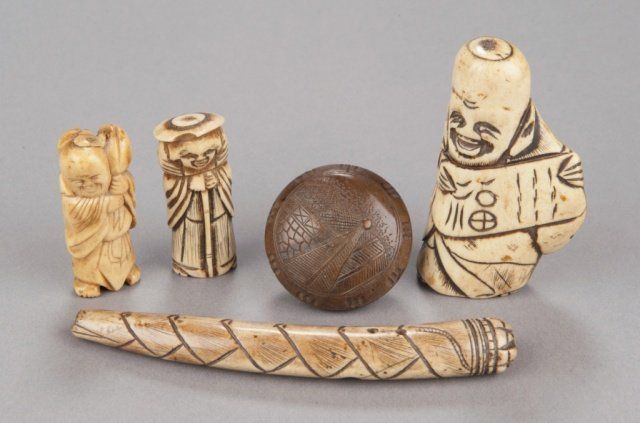The first,mid 19th century, in stag antler, the Chinese sage Tobosaku carrying a huge peach on his shoulder. 2 1/8in (5.3cm). The second, mid 19th century, in bone, a Monk. 2 1/8in (5.5cm). The third, mid 19th century, in wood, two piece manju, the obverse with steeple of a building in front of a wall, the reverse with an incised deign of Bamboo. 1 3/4in (4.4cm). The fourth, early 19th century, in stag antler, the Taoist rishi Kanzan reading a scroll. 3 1/8in (8cm). The fifth, mid 19th century, in stag antler, of a bamboo shoot. 4 7/8in (12.4cm).
