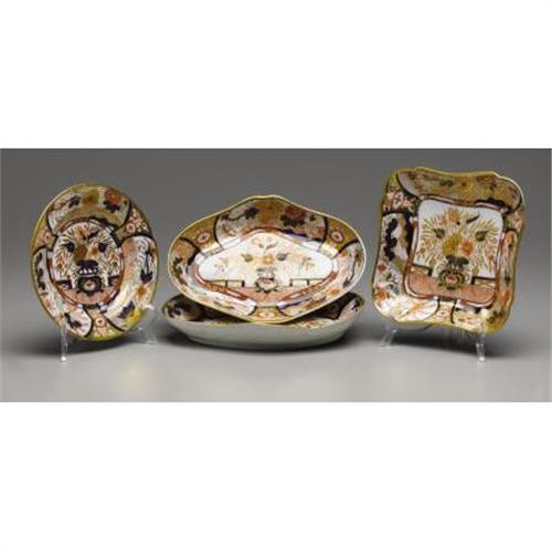<B>A Group of Four Spode or Derby Imari Pattern Dishes<BR></B></I>Early Nineteenth Century<BR> Comprising two lozenge shaped dishes; one squared dish; and one circular plate. All decorated with lions, birds, insects and urns issuing flowers, in iron red, cobalt blue and gilt.<BR> <B>Condition Report:</B> Areas of wear to gilt.<BR><BR><b>Shipping:</b> Hollowware/Pottery/Glass, Small (<a target="_blank" href="http://www.heritageauctions.com/common/shipping.php">view shipping information</a>)