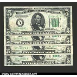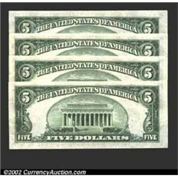 A group of four consecutively serial numbered 1934-D $5 Federal Reserve Notes, Fr-1960-A, all gradin
