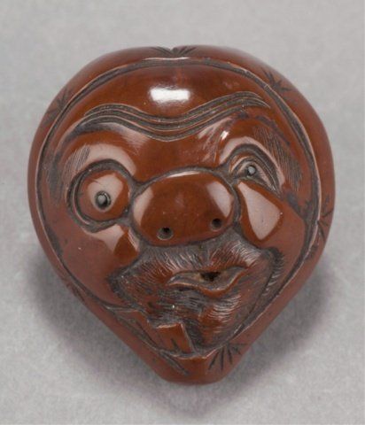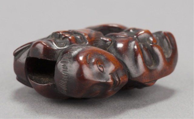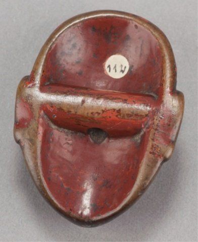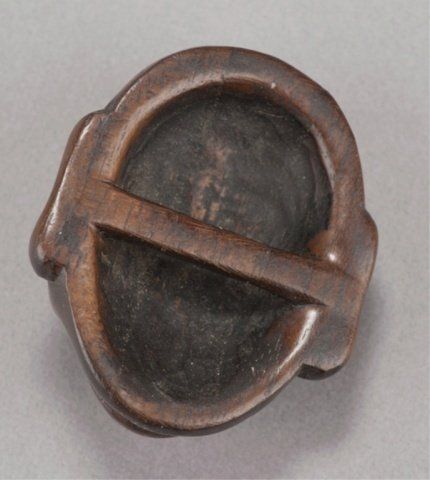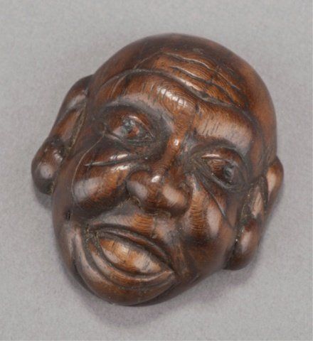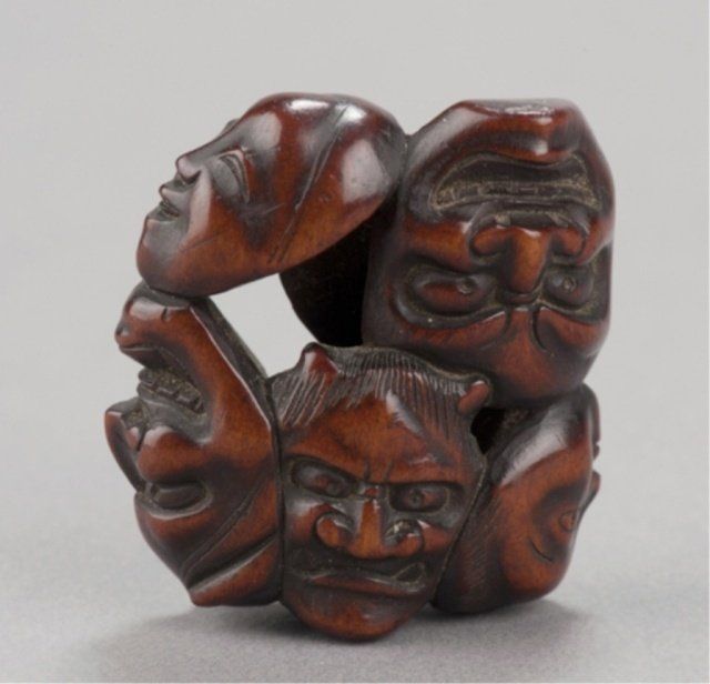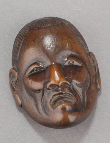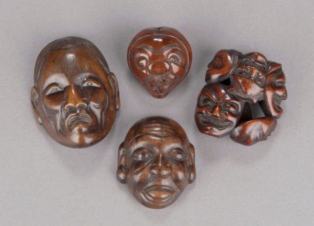 The first, early 19th century, a wood unidentified mask of a man with down turned mouth, short hair with traces of red on it, the back has been lacquered red. 2in (5.1cm). The second, 19th/20th century, a karumi mask of Usofuki, eyes inlaid in black, the reverse with a design of a shell. 1 1/4in (3.2cm). The third, early 19th century, a wood unidentified mask with an idiotic look, heavy eyes, fat lips and bulging tongue. 1 5/8in (4cm). The fourth, 19th/20th century, a wood group of seven masks, heavy brown and black stain, cord attachment through natural openings. 1 1/2in (3.9cm).