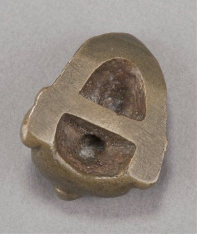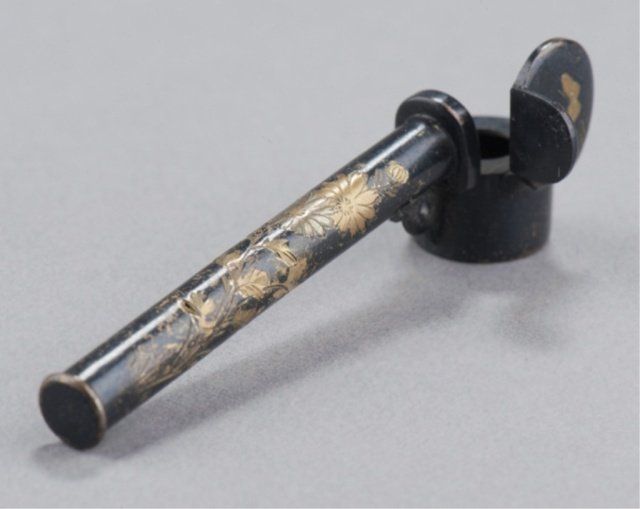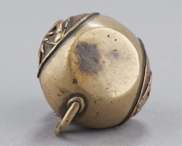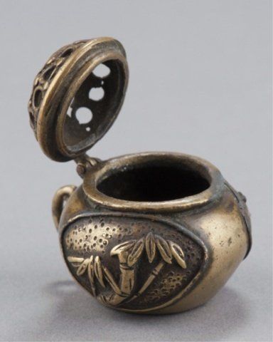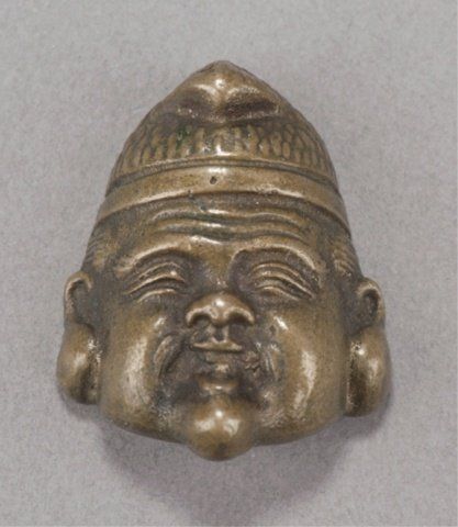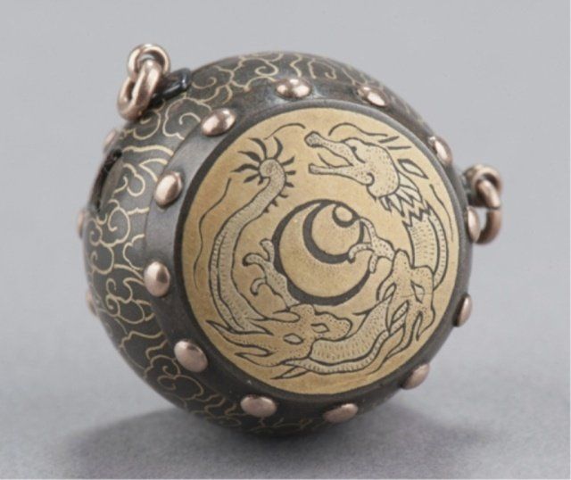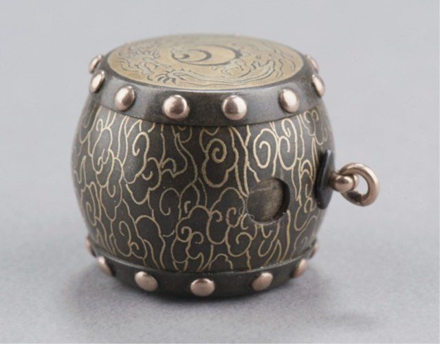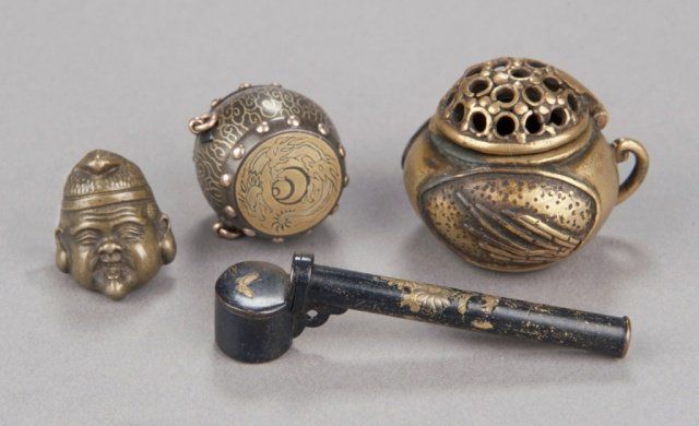 Mid/late 19th century. The first, a solid brass mask of Ebisu, attachment by a small cross-bar on the back. 1in (2.6cm). The fourth, a late 19th century brass hand-warmer netsuke in the style developed by Kyubei,the ends etched with a dragon design, the sides with a design of bamboo. 1 3/8in (3.6cm). The second, a shakudo Taiko drum shaped tobacco-ire, the sides with a thick gold damascene design of clouds, 1 1/8in (2.7cm). The third, a shakudo miniature yatate, with gold inlay of flowers and butterfly. 2 3/4in (6.9cm). The fourth, a brass hand warmer in the style of Kyubei, top is reticulated and hinged. 1 3/8in (3.6cm). Provenance: The second and third, Purchased from Raymond Bushell 1960. The third, Exhibited: the Student Center (August 29 - September 25, 1960)