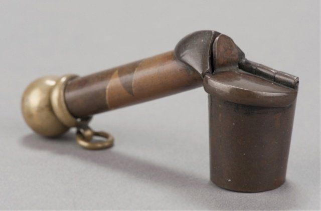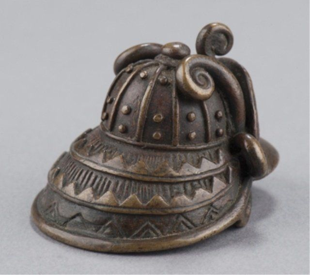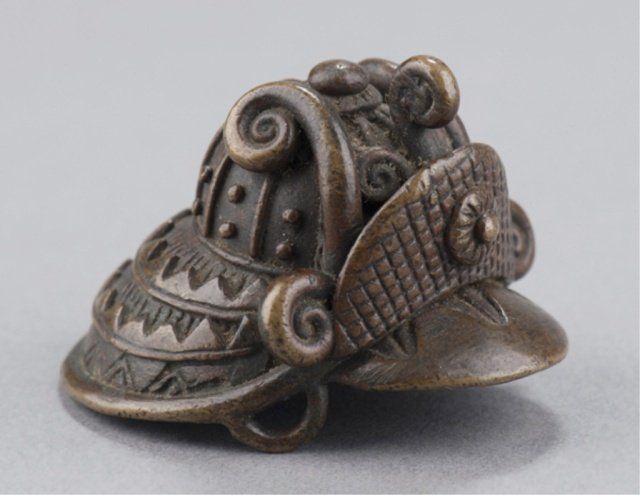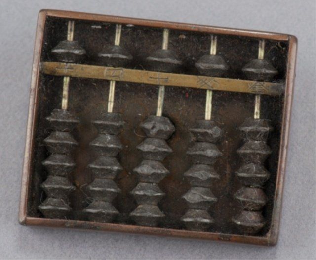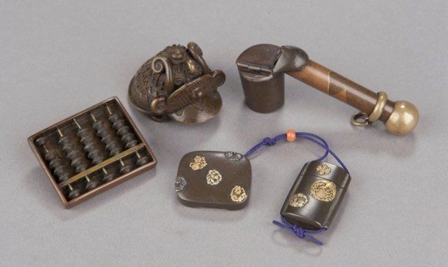 Mid 19th century. The first, a copper working Soroban(Abacus), the inner frame is sentoku, and the counters are iron. 1 3/8in (3.4cm). The second, a bronze samurai helmet ash tray of the type made by Kyubei. 1 1/4in (3.1cm). The third, a shibuichi hako seal-ink box, with a very similar one-case miniature inro, with applied floral clusters and mon, gold and silver on the hako and gold on the inro. 1 1/4in (3.1cm). The fourth, a brass, bronze, and sentoku yatate, thebronze bowl with hinged top, the brush tube has two types of sentoku joined in an irregular pattern capped at the end by a large brass ball. 3 1/8in (7.9cm).