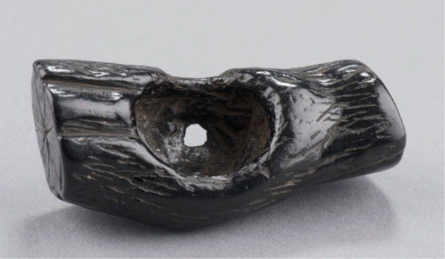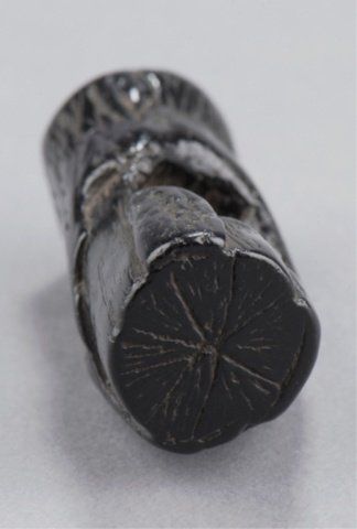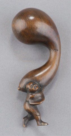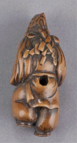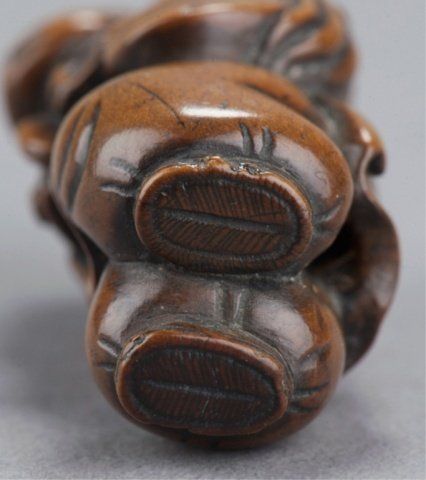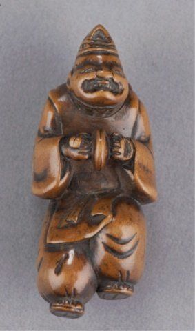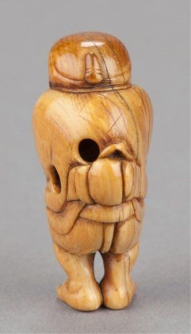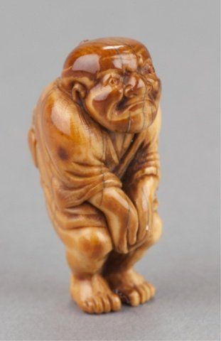 The first, late 19th century, a wood sambaso dancer balancing on one foot. 2 1/8in (5.2cm). The second, early 19th century, an ivory yakuza, in a semi-squatting position, hands clasped together in front of him. 1 7/8in (4.8cm). The third, mid 19th century, a wood wrestler balancing an enormous gourd over his head, the front half of his right foot has been replaced. 2 3/4in (7.1cm). The fourth, mid 19th century, a wood Ashtray netsuke in the form of a stick of charcoal, the partially torn bark well rendered. 2 1/8in (5.5cm).