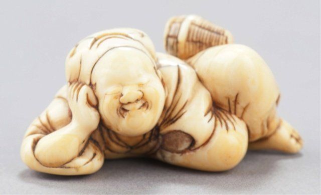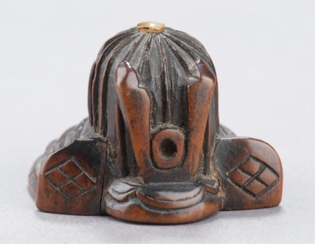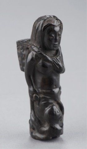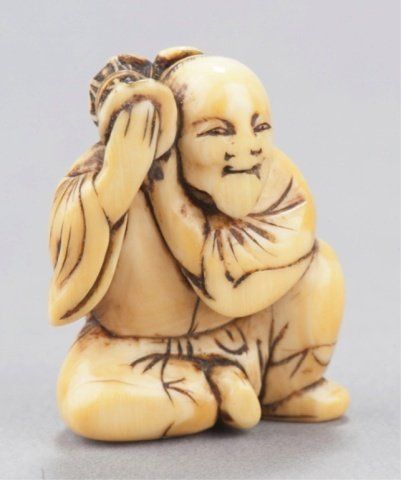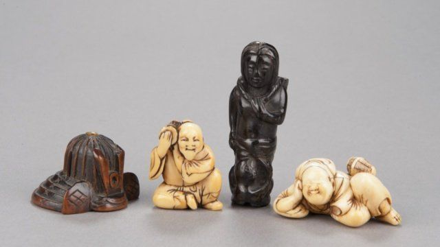 The first, mid 19th century, a wood ash bowl in the shape of a Samurai helmet, the finial of light horn. 1 1/8in (2.9cm). The second, late 18th century, an ivory bearded and seated Manzai Dancer, holding a tsuzumi drum on his right shoulder with both hands. 1 1/2in (3.7cm). The third, mid 19th century, an ebony figure of a Fisher Girl, with a basket on her back. 2 5/8in (6.7cm). The fourth, late 18th century, an ivory reclining man resting his head on his right hand, and he has a small woven basket attached to his left hip. 2in (5cm). Provenance: The first, Ex Dr. Bernard Rosett collection (Sotheby's, New York)