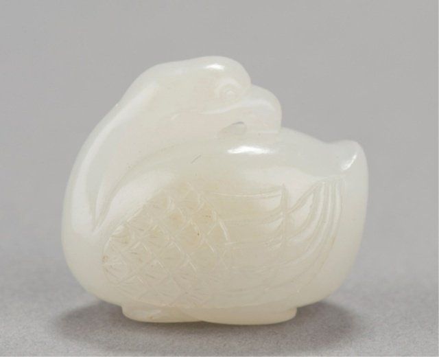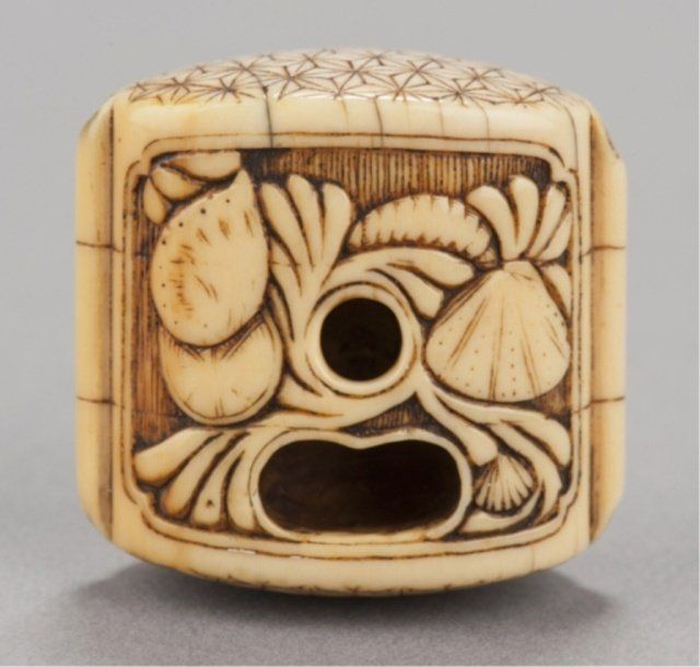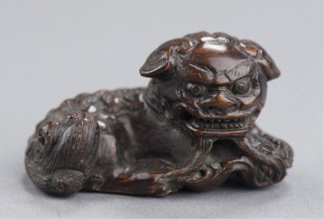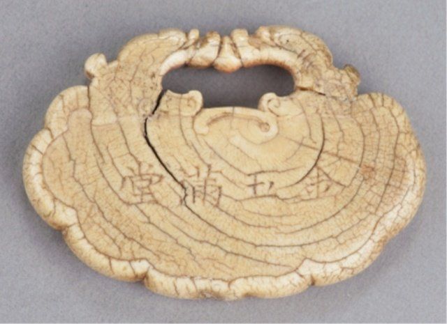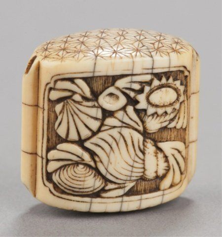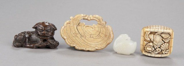 The first, mid 19th century, a seated shishi, a Chinese toggle repurposed as a netsuke with an added signature. 2in (5cm). The second, late 17th century, a Chinese lock-shaped mammoth ivory toggle with four characters on each side. 1 5/8in (4.1cm). The third, mid 19th century, a Chinese jade fingering piece in the shape of a swan. 7/8in (2.3cm).The fourth, late 18th century, an ivory netsuke carved in the shape of an inro. The top and bottom bear a diaper pattern while the front and back feature relief carving of shell motifs. 1 3/4in (4.3cm). Provenance: The first, Ex Scott Meredith collection.