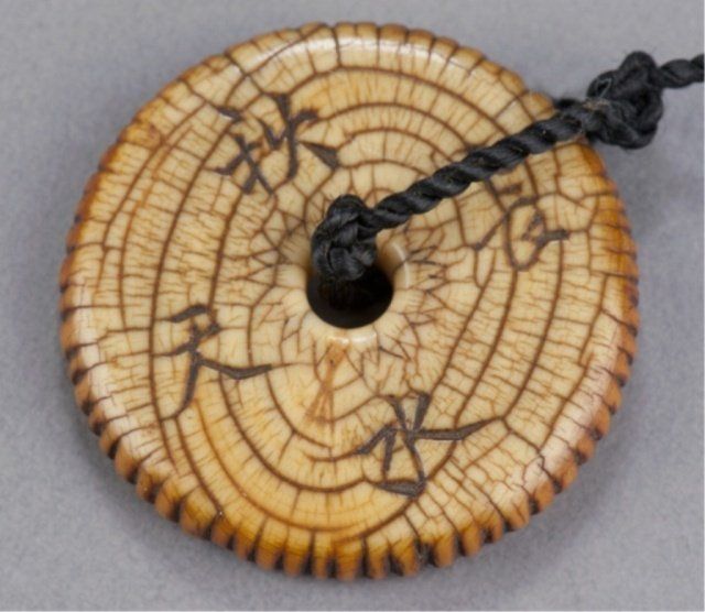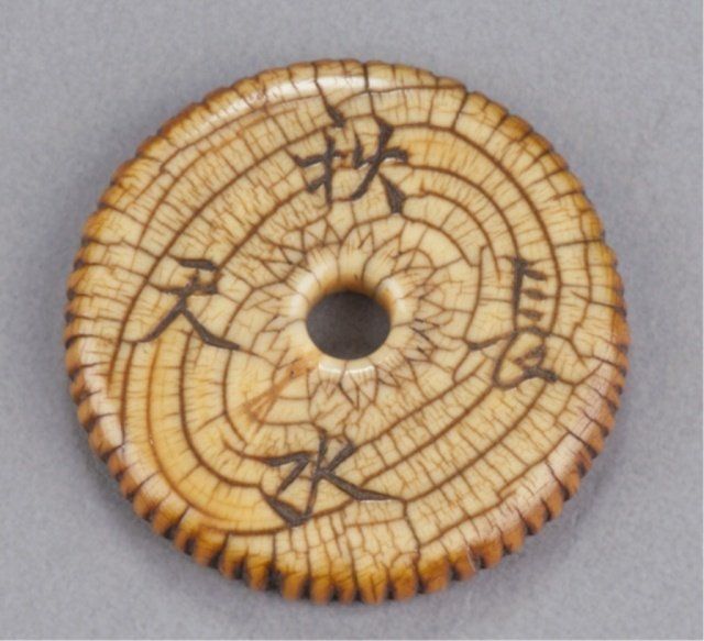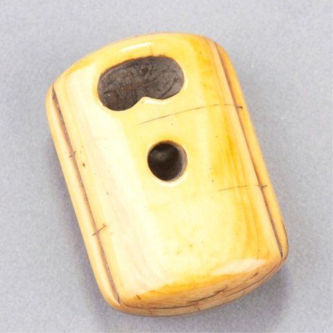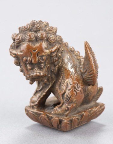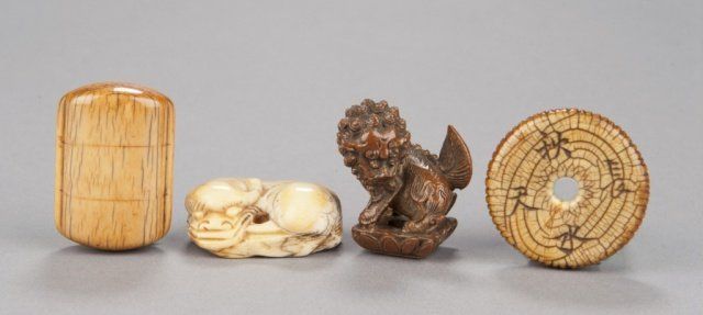 The first, late 18th century, in ivory, in the shape of a two-case inro, with cord channels on the sides and the lines that delineate the compartments. 1 3/4in (4.5cm). The second, 18th century, in ivory, Chinese toggle of a Shishi Lion or dragon. 1 5/8in (4.1cm). The third, early 19th century, in wood, a Shishi lion, from a Chinese shrine. 1 5/8in (4.1cm). The fourth, 17th/18th century, in mammoth ivory, manju shaped like a Chinese toggle with a serrated edge, the front showing four Chinese characters, the reverse with a curve in the appearance of a yang-yin symbol, and addition of two inlaid metal eyelets. 1 5/8in (4.2cm). Provenance: The fourth, Matthies Collection, Sotheby's, New York, 1965.
