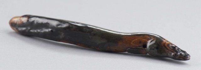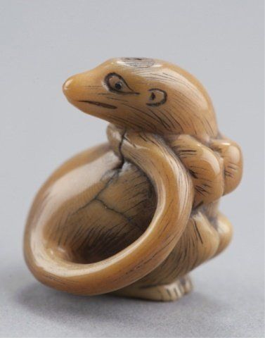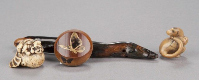 Mid 19th century. The first, in bone, Ebisu riding a giant fish, There are traces of an old signature that has been eradicated by wear. The bone is possibly the jaw-bone of a sperm whale (see Penniman: Pictures of Ivory ... , 1952, plate XV -2). Ex Barry Davies Oriental Art, London. 1 1/8in (2.9cm). The second, a bamboo manju with a gold lacquered butterfly, a small butterfly on one side in black lacquer. 1 5/8in (4.1cm). The third, a umimatsu moray eel. 6 1/8in (15.6cm). The fourth,a corozo nut ferret, signed on the back, Yukimasa, in sosho. 1 3/8in (3.4cm).