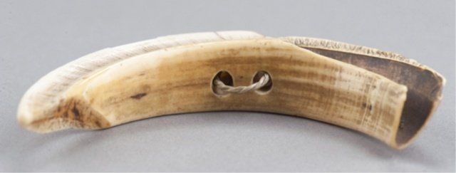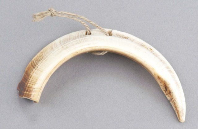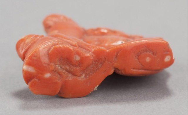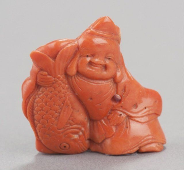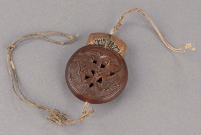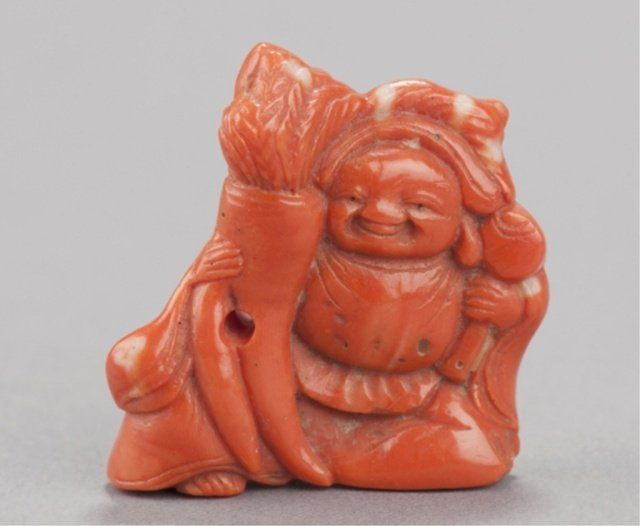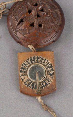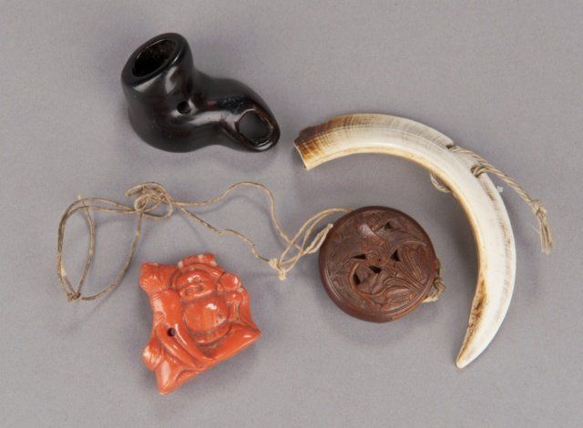 The first, mid 19th century, in coral, Ebisu holding up a large fish and, on the reverse Daikoku with his mallet. 1 5/8in (4.1cm). The second, mid 19th century, a wood ryusa manju depicting a stork and ginkgo leaves, a section of the rim slides out and reveals a compass marked in gold with signs of the Zodiac. 1 1/2in (3.9cm). The third, 19th/20th century boar's tusk, adapted by adding himotoshi. 3 3/4in (9.4cm). The fourth, mid 19th century, in umimatsu, formed from the joining of two branches. 1 7/8in (4.7cm).