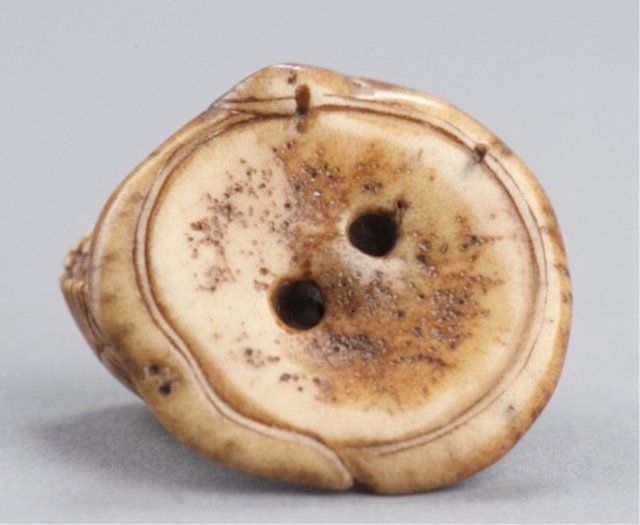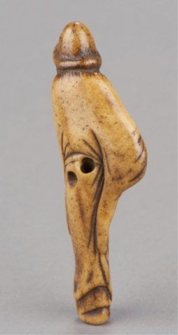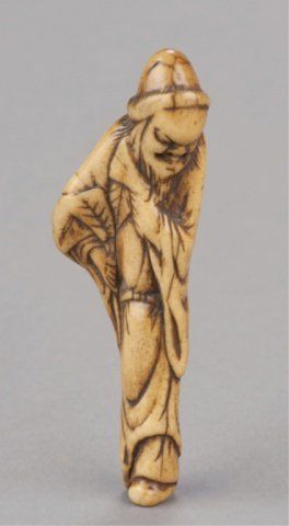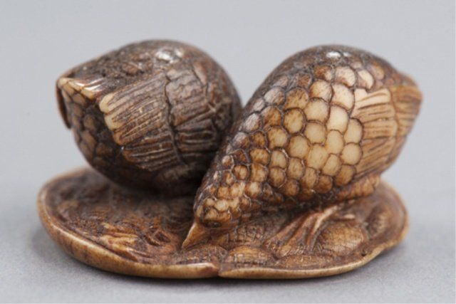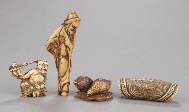 The first, late 18th century, a seated actor wearing a mask and holding an open fan in his left hand, on his extended right arm sits a puppet holding a rake with which he brushes the head of the actor. 1 5/8in (4.3cm). The second, early 19th century, a Sennin trudging with head down, holding his robe closed against the cold with his left hand. 4in (10.1cm). The third, mid 19th century model of two quail eating millet seeds. 1in (2.4cm). The fourth, mid 19th century, a curled up Kasa. 2 3/4in (7cm).